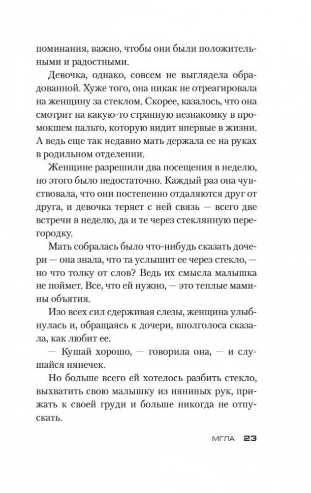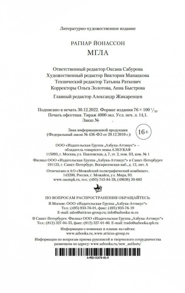 В отдаленной бухте среди скал обнаружено тело молодой русской женщины. Приехав в Исландию в поисках лучшей доли, она нашла смерть в ледяной воде северного моря. Обстоятельства трагедии выяснить не удалось, и дело было закрыто. Прошел год, прежде чем Хюльда Херманнсдоуттир, инспектор полиции Рейкьявика, извлекла его из архива. Для Хюльды это было последнее расследование, и оставалось лишь нескольких дней до окончания ее службы в полиции… Действие романа разворачивается на фоне завораживающих пейзажей пустынного исландского нагорья и величественных фьордов, затерянных среди скал. «Мгла», первый роман в трилогии о Хюльде, мгновенно стал мировым бестселлером и занял верхние строчки престижных литературных рейтингов, а Рагнар Йонассон закрепил за собой титул «короля скандинавского нуара».