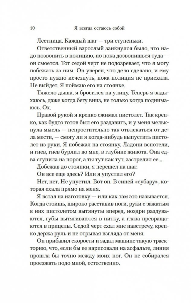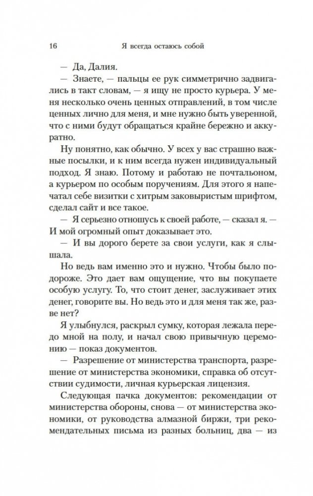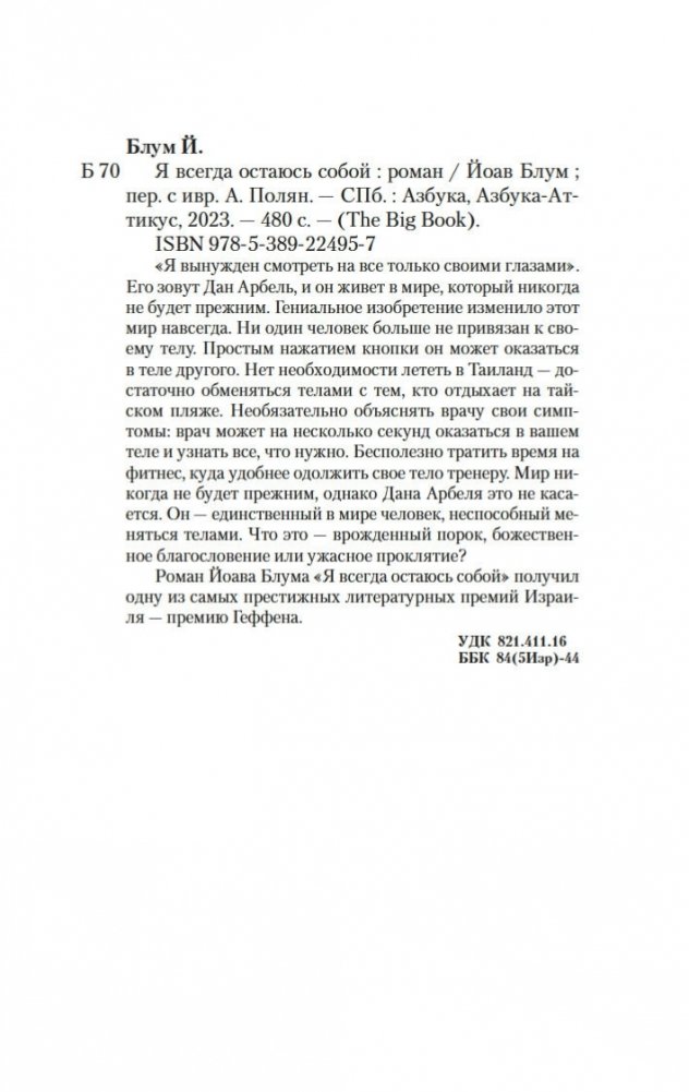 «Я вынужден смотреть на все только своими глазами». Его зовут Дан Арбель, и он живет в мире, который никогда не будет прежним. Гениальное изобретение изменило этот мир навсегда. Ни один человек больше не привязан к своему телу. Простым нажатием кнопки он может оказаться в теле другого. Нет необходимости лететь в Таиланд — достаточно обменяться телами с тем, кто отдыхает на тайском пляже. Необязательно объяснять врачу свои симптомы: врач может на несколько секунд оказаться в вашем теле и узнать все, что нужно. Бесполезно тратить время на фитнес, куда удобнее одолжить свое тело тренеру. Мир никогда не будет прежним, однако Дана Арбеля это не касается. Он — единственный в мире человек, неспособный меняться телами. Что это — врожденный порок, божественное благословение или ужасное проклятие? Роман Йоава Блума «Я всегда остаюсь собой» получил одну из самых престижных литературных премий Израиля — премию Геффена.