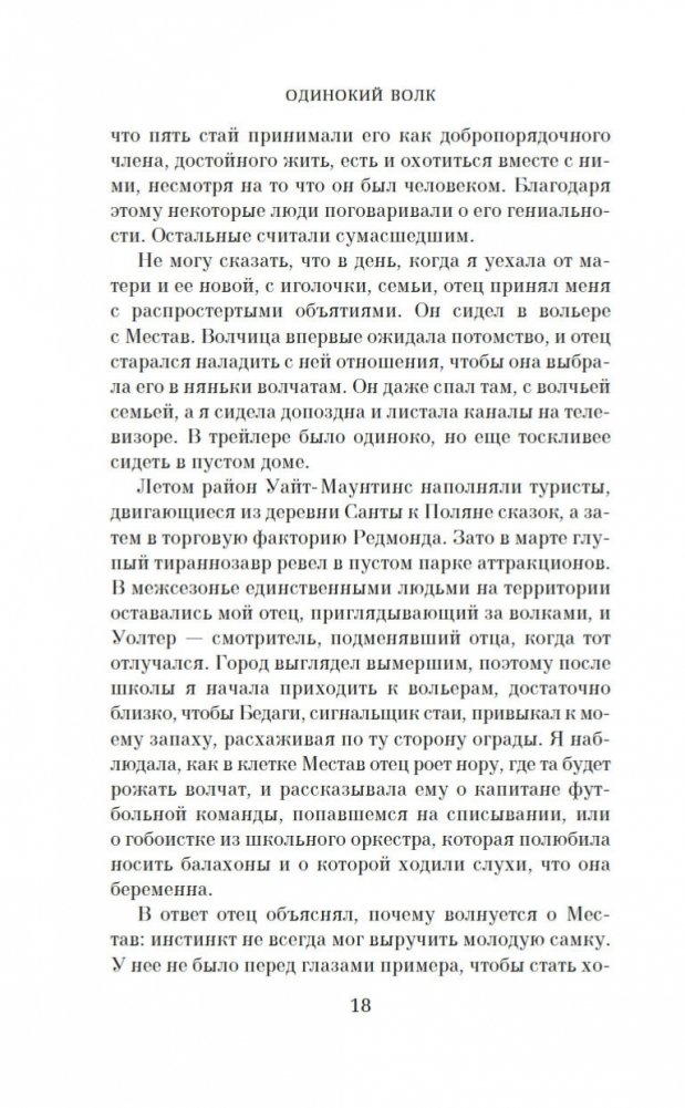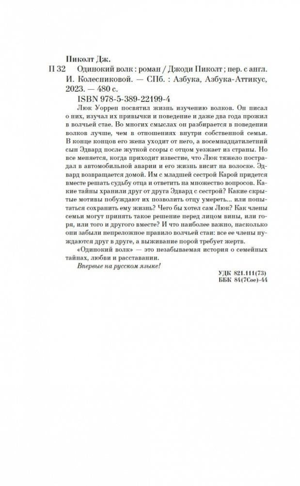 Люк Уоррен посвятил жизнь изучению волков. Он писал о них, изучал их привычки и поведение и даже два года прожил в волчьей стае. Во многих смыслах он разбирается в поведении волков лучше, чем в отношениях внутри собственной семьи. В конце концов его жена уходит от него, а восемнадцатилетний сын Эдвард после жуткой ссоры с отцом уезжает из страны. Но все меняется, когда приходит известие, что Люк тяжело пострадал в автомобильной аварии и его жизнь висит на волоске. Эдвард возвращается домой. Им с младшей сестрой Карой придется вместе решать судьбу отца и ответить на множество вопросов. Какие тайны хранили друг от друга Эдвард с сестрой? Какие скрытые мотивы побуждают их позволить отцу умереть... или попытаться сохранить ему жизнь? Чего бы хотел сам Люк? Как члены семьи могут принять такое решение перед лицом вины, или горя, или того и другого вместе? И что наиболее важно, насколько они забыли непреложное правило волчьей стаи: все ее члены нуждаются друг в друге, а выживание порой требует жертв. «Одинокий волк» — это незабываемая история о семейных тайнах, любви и расставании. Роман издается в новом переводе.
