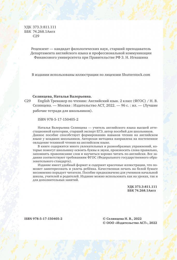В книге содержится много увлекательных и разнообразных упражнений, которые помогут школьнику освоить буквы и звуки, произносить слова правильно, запомнить правописание слов и научиться хорошо читать по-английски. Все задания соответствуют требованиям ФГОС (Федерального государственного образовательного стандарта).