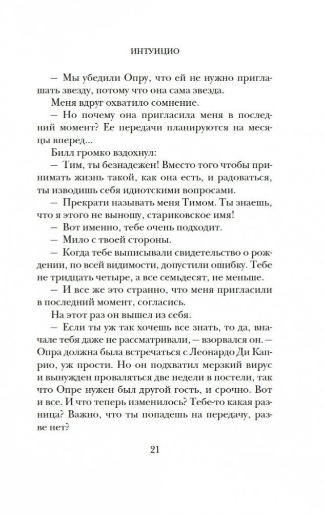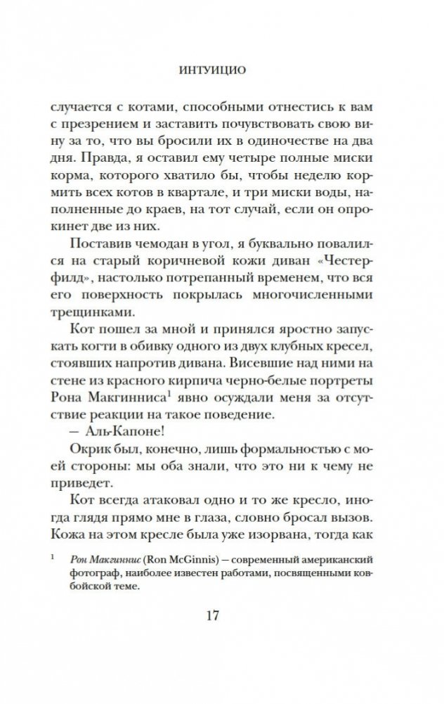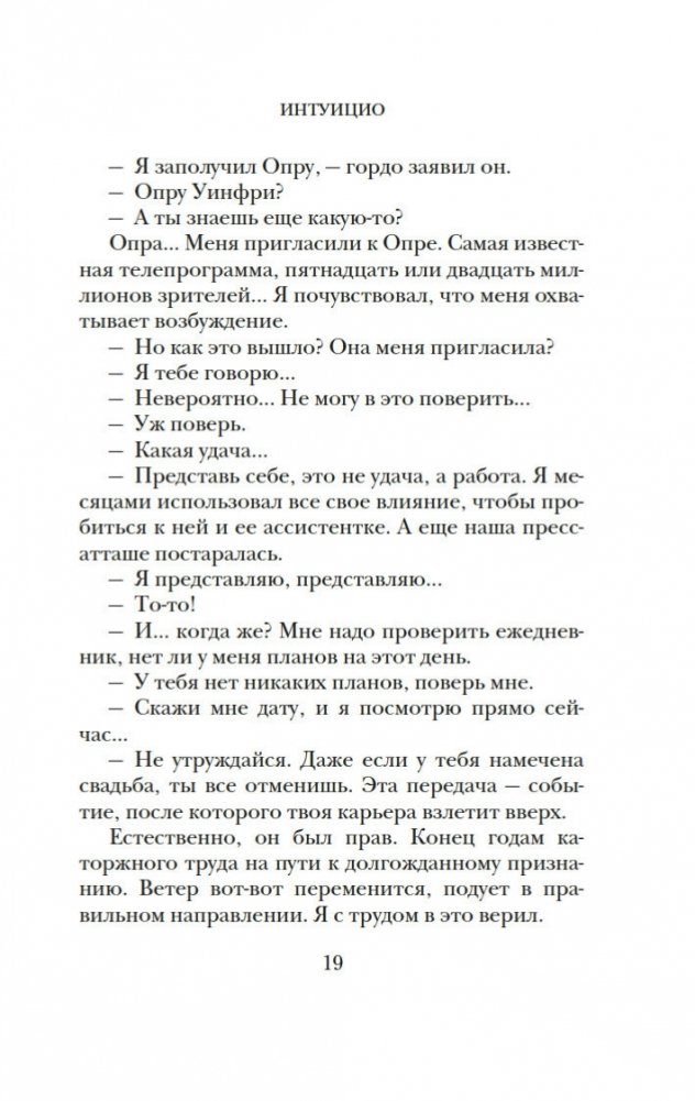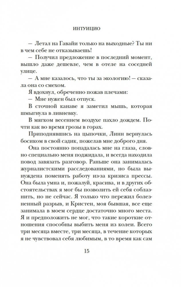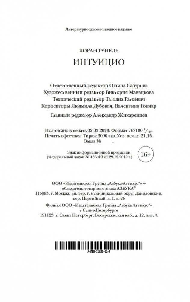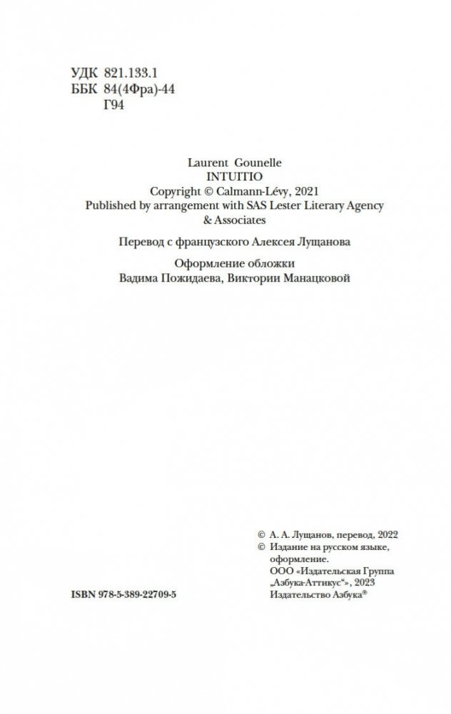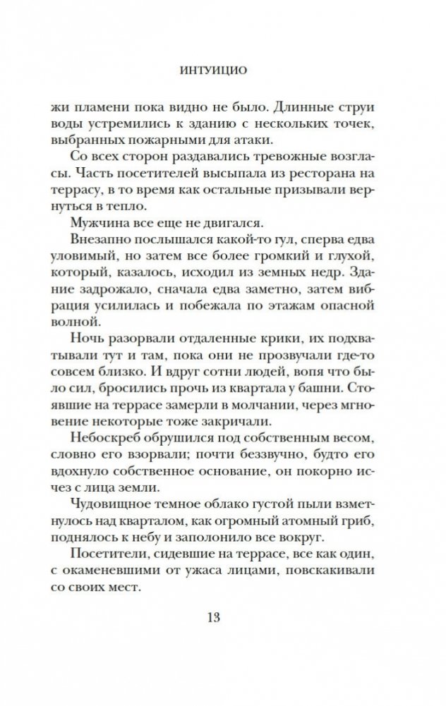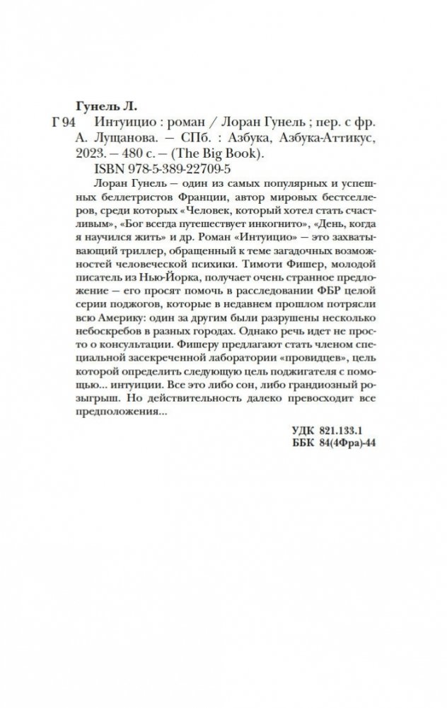 Лоран Гунель — один из самых популярных и успешных беллетристов Франции, автор мировых бестселлеров, среди которых «Человек, который хотел стать счастливым», «Бог всегда путешествует инкогнито», «День, когда я научился жить» и др. Роман «Интуицио» — это захватывающий триллер, обращенный к теме загадочных возможностей человеческой психики. Тимоти Фишер, молодой писатель из Нью-Йорка, получает очень странное предложение — его просят помочь в расследовании ФБР целой серии поджогов, которые в недавнем прошлом потрясли всю Америку: один за другим были разрушены несколько небоскребов в разных городах. Однако речь идет не просто о консультации. Фишеру предлагают стать членом специальной засекреченной лаборатории «провидцев», цель которой определить следующую цель поджигателя с помощью... интуиции. Все это либо сон, либо грандиозный розыгрыш. Но действительность далеко превосходит все предположения...
