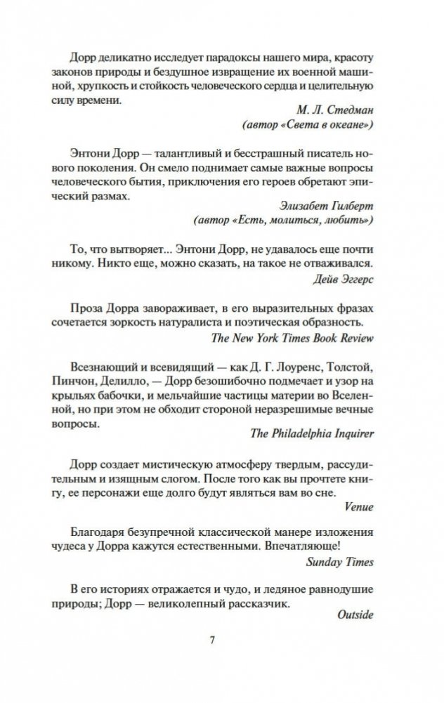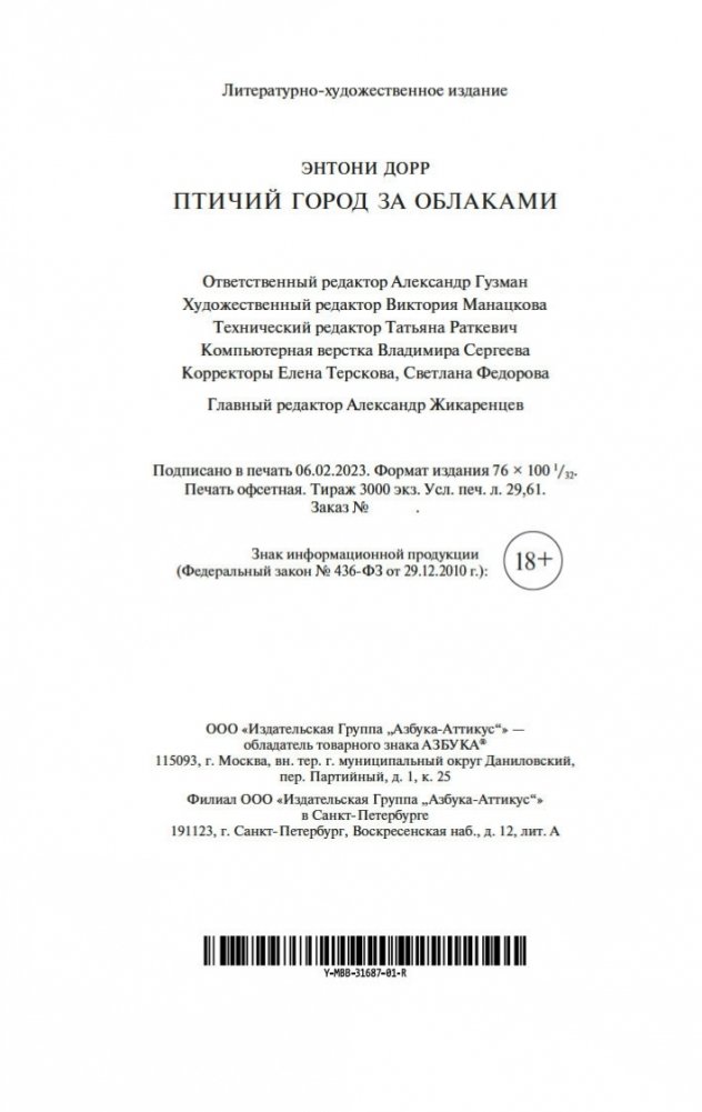 Новейший роман Энтони Дорра, автора книги «Весь невидимый нам свет», удостоенной Пулицеровской премии; как и этот международный бестселлер, «Птичий город за облаками» был включен в шорт-лист Национальной книжной премии США. Роман выстроен подобно матрешке (или «Облачному атласу» Дэвида Митчелла): здесь хитроумно перекрещиваются жизни и судьбы Анны и Омира, пребывающих по разные стороны стены в осажденном турками Константинополе 1453 года, а также пожилого энтузиаста древнегреческой литературы Зено и юного экотеррориста Сеймура в современном Айдахо, а также Констанции, которая летит к далекой экзопланете на корабле «Арго» под управлением всезнающей Сивиллы. Подобно Мари-Лоре и Вернеру в романе «Весь невидимый нам свет», все пятеро здесь — мечтатели и аутсайдеры, не теряющие надежды и посреди самого беспросветного, казалось бы, хаоса и отчаяния: «„Птичий город за облаками“ показывает, что для нас еще не все потеряно — и что важным инструментом спасения является именно литература» (Boston Globe) — например, мифическая история древнего грека Аитона, мечтающего обернуться птицей и улететь в сказочный заоблачный город… «„Птичий город за облаками“ охватывает невероятный диапазон знаний и жизненного опыта. Это человечная и вдохновляющая книга для взрослых, наполненная незабываемой магией читательских впечатлений детства» (New York Times Book Review).