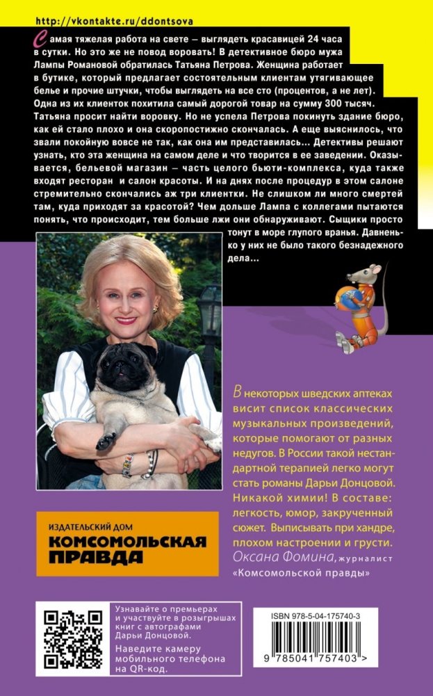 Самая тяжелая работа на свете — выглядеть красавицей 24 часа в сутки. Но это же не повод воровать! В детективное бюро мужа Лампы Романовой обратилась Татьяна Петрова. Женщина работает в бутике, который предлагает состоятельным клиентам утягивающее белье и прочие штучки, чтобы выглядеть на все сто (процентов, а не лет). Одна из их клиенток похитила самый дорогой товар на сумму 300 тысяч. Татьяна просит найти воровку. Но не успела Петрова покинуть здание бюро, как ей стало плохо, и она скоропостижно скончалась. А еще выяснилось, что звали покойную вовсе не так, как она им представилась… Детективы решают узнать, кто эта женщина на самом деле и что творится в ее заведении. Оказывается, бельевой магазин — часть целого бьюти-комплекса, куда также входят ресторан и салон красоты. И на днях после процедур в этом салоне стремительно скончались аж три клиентки. Не слишком ли много смертей там, куда приходят за красотой? Чем дольше Лампа с коллегами пытаются понять, что происходит, тем больше лжи они обнаруживают. Сыщики просто тонут в море глупого вранья. Давненько у них не было такого безнадежного дела…