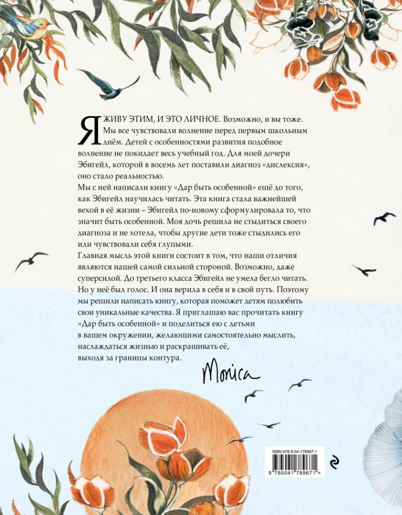 Книга призвана помочь детям без страха и стеснения проявлять свою индивидуальность. Она выделяется своими необычными и очень красочными иллюстрациями Сонии Поссентини, известной детской художницы и лауреата премии Андерсена. Повествование идет от лица 8-летней Эбигейл, неожиданно узнавшей о том, что у неё дислексия. Девочка решила вместе с мамой разобраться, что же означает это странное слово. Диагноз? Приговор? Нет, на самом деле это суперсила! Эбигейл выяснила, как превратить свои особенности в сверхспособности, и с радостью делится этим удивительным открытием с другими детьми.