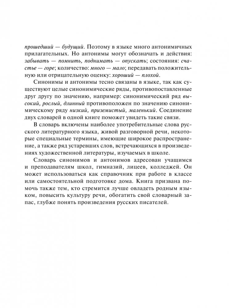 Предлагаемый словарь содержит более 5000 слов и состоит из двух частей: словаря синонимов и словаря антонимов.