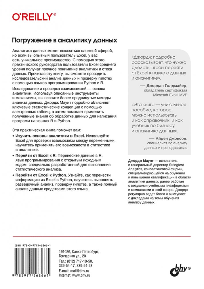 В книге приводятся практические приемы анализа данных. Рассказано, как исследовать и тестировать взаимосвязи между переменными в Excel и использовать его для статистики и анализа. Описан перенос данных из Excel в R, язык программирования с открытым исходным кодом, специально разработанный для выполнения статистического анализа. Отдельный раздел посвящен переносу данных из Excel в Python и выполнению полного анализа данных средствами этого языка. В результате читатель научится выполнять разведочный анализ данных (Exploratory Data Analysis, EDA) и проверку гипотез с использованием языков программирования Python и R.