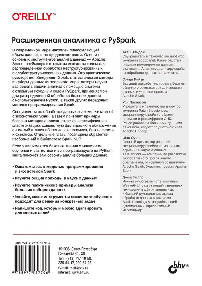 Книга посвящена практическим методам анализа больших объемов данных с использованием языка Python и фреймворка Spark, она знакомит с моделью программирования Spark и основами системы с открытым исходным кодом PySpark. Каждая глава описывает отдельный аспект анализа данных, показаны основы обработки данных в PySpark и Python на примере очистки данных, подробно освещается машинное обучение с помощью Spark. Книга поможет читателю понять, как устроен и работает весь конвейер PySpark для комплексной аналитики больших наборов данных: от создания и оценки моделей до очистки, предварительной обработки и исследования данных с особым акцентом на производственные приложения. Отдельные главы посвящены обработке изображений и библиотеке Spark NLP.