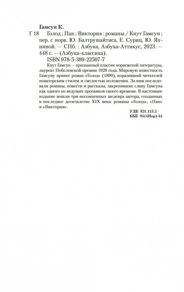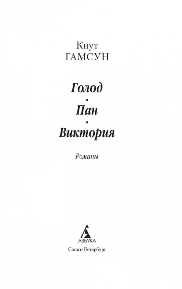 Кнут Гамсун — признанный классик норвежской литературы, лауреат Нобелевской премии 1920 года. Мировую известность Гамсуну принес роман «Голод» (1890), поразивший читателей новаторским стилем и смелостью изложения. За ним последовали романы, повести и рассказы, закрепившие славу Гамсуна как одного из ведущих прозаиков своего времени. В настоящее издание вошли три несомненных шедевра автора, созданных в последнее десятилетие XIX века: романы «Голод», «Пан» и «Виктория».