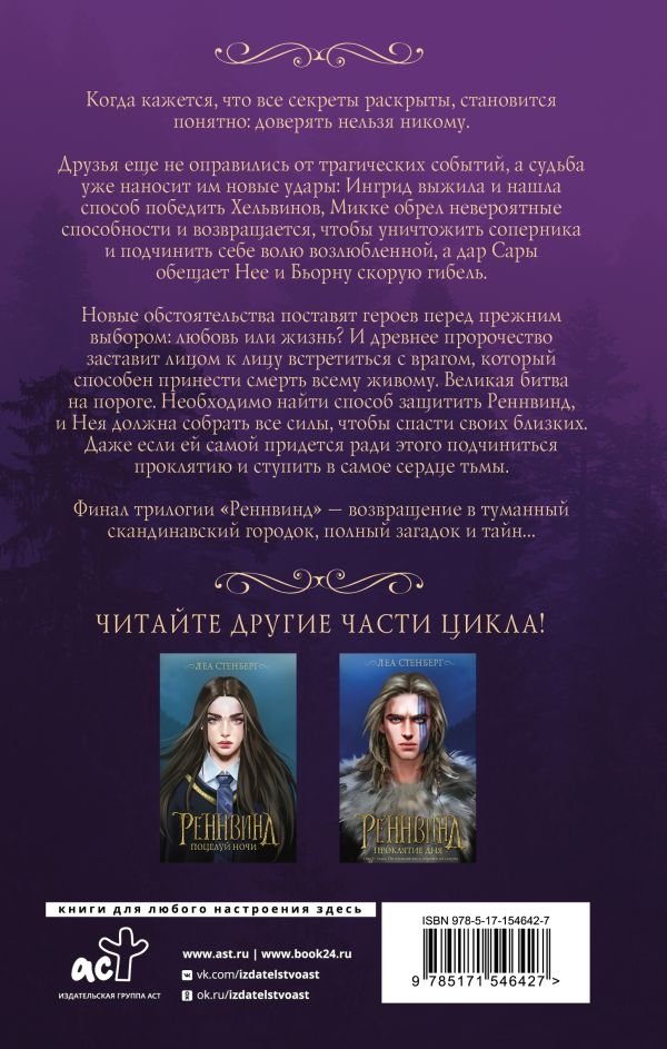 Когда кажется, что все секреты раскрыты, становится понятно: доверять нельзя никому. Друзья еще не оправились от трагических событий, а судьба уже наносит им новые удары: Ингрид выжила и нашла способ победить Хельвинов, Микке обрел невероятные способности и возвращается, чтобы уничтожить соперника и подчинить себе волю возлюбленной, а дар Сары обещает Нее и Бьорну скорую гибель. Новые обстоятельства поставят героев перед прежним выбором: любовь или жизнь? И древнее пророчество заставит лицом к лицу встретиться с врагом, который способен принести смерть всему живому. Великая битва на пороге. Необходимо найти способ защитить Реннвинд, и Нея должна собрать все силы, чтобы спасти своих близких. Даже если ей самой придется ради этого подчиниться проклятию и ступить самое сердце тьмы.