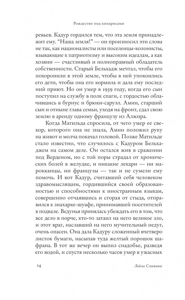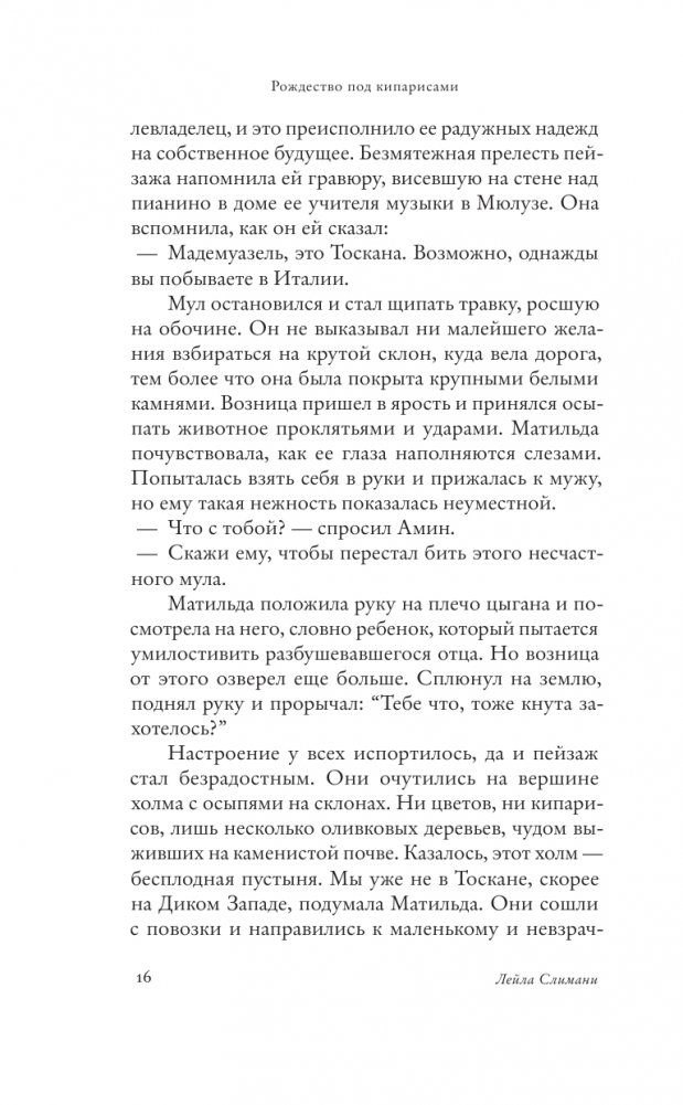 «Рождество под кипарисами» — первая часть трилогии «Страна других». Это история, основанная на событиях из жизни бабушки, дедушки и матери Лейлы Слимани, автора романа. Семья Бельхадж, живущая на ферме в пригороде Мекнеса, вызывает недоумение и неприязнь как французов, так и марроканцев. И действительно, где это видано, чтобы араб женился на француженке. Матильда, познакомившись с Амином во время второй мировой, после войны переезжает к мужу на родину, чтобы вместе с ним окультуривать неплодородную землю, купленную еще его отцом. Местные с подозрением относятся к Амину, который говорит по‑французски без акцента. Над Матильдой злобно посмеиваются француженки на главных улицах Мекнеса, презрительно глядя на ее огрубевшие руки и стоптанную обувь. А их дочь Аиша, тихий и мечтательный ребенок, терпит насмешки одноклассниц из католической школы. Да и внутри семьи не все гладко — уж слишком много различий между культурами, темпераментами и желаниями мужа и жены. Но семья есть семья, и в особенности это ощущается во времена больших потрясений. В Марокко созревает национальное движение, рабочие жгут французские владения... Что станет с семьей, не принадлежащей ни к тем, ни к другим? Избегут ли они надвигающейся опасности?