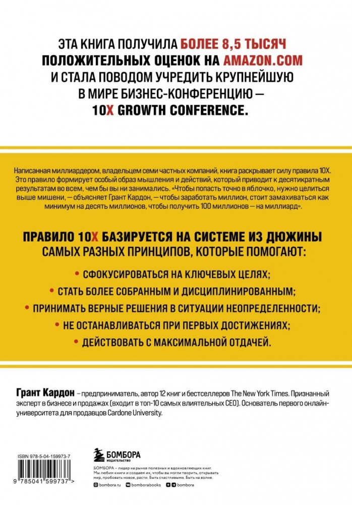 Эта книга написана миллиардером, владельцем семи частных компаний, она раскрывает силу правила 10Х. Это правило формирует особый образ мышления и действий, который приводит к десятикратным результатам во всем, чем бы вы не занимались. "Чтобы попасть точно в яблочко, нужно целиться выше мишени, — объясняет Гранд Кардон, — Чтобы заработать миллион, стоит замахиваться как минимум на десять миллионов, чтобы получить 100 миллионов — на миллиард".