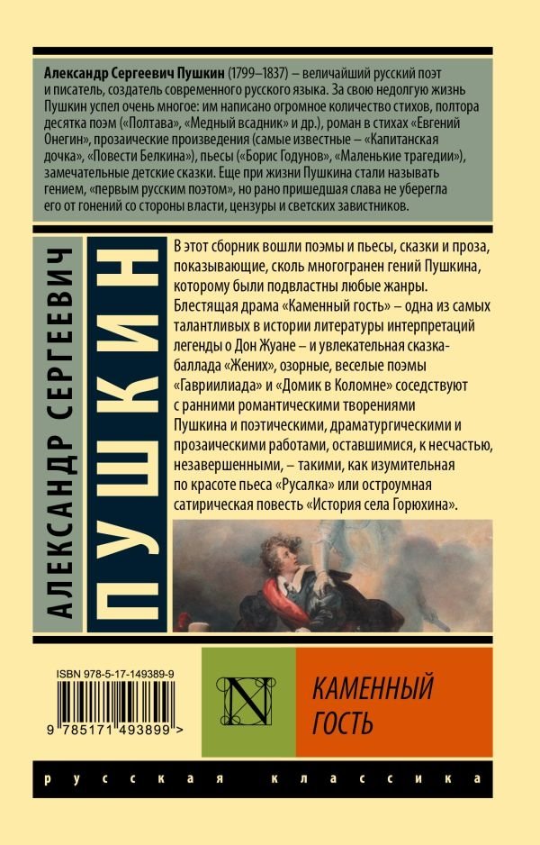 Блестящая драма "Каменный гость" — одна из самых талантливых в истории литературы интерпретаций легенды о Дон Жуане — и увлекательная сказка-баллада "Жених", озорные, веселые поэмы "Гавриилиада" и "Домик в Коломне" соседствуют с ранними романтическими творениями Пушкина и поэтическими, драматургическими и прозаическими работами, оставшимися, к несчастью, незавершенными, — такими, как изумительная по красоте пьеса "Русалка" или остроумная сатирическая "История села Горюхина".
