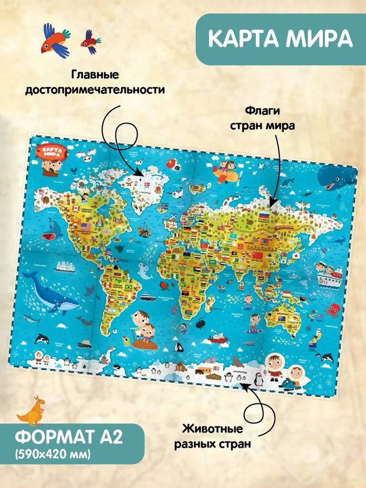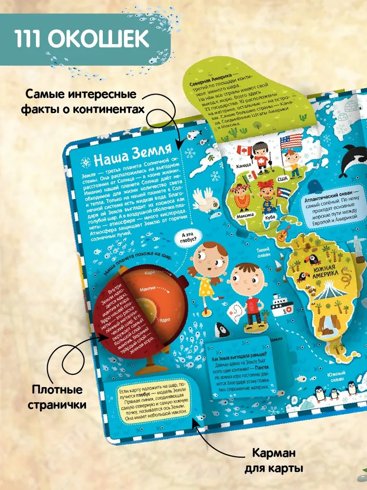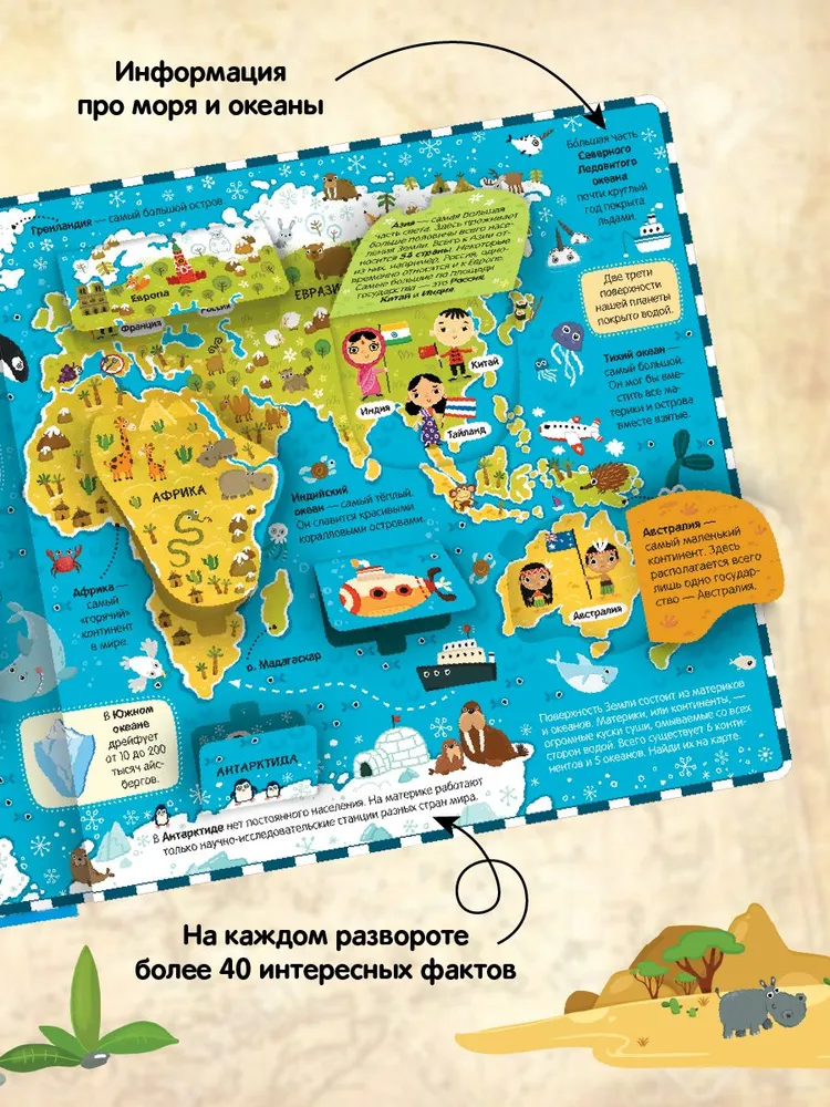 Атлас. Путешествие по материкам из серии «Большая энциклопедия» — это настоящий атлас мира для вашего малыша. Вместе с персонажами-путешественниками на страницах книги он посетит каждый материк, узнает о нём много интересных фактов, познакомится с флорой и фауной, самыми интересными и знаменитыми достопримечательностями. Во вложении к энциклопедии — большая карта мира, по которой удобно изучать государства и флаги. Красочные иллюстрации, сотни открывающихся окошек, интересные факты — отправляйтесь в кругосветное путешествие вместе с книгой «Атлас. Путешествие по материкам».