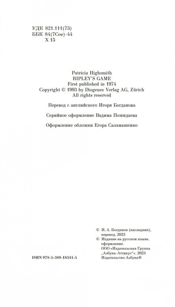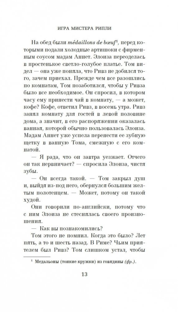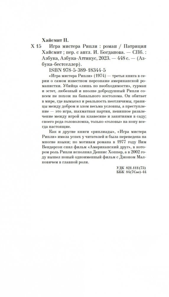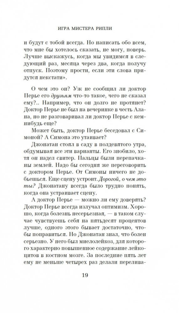 «Игра мистера Рипли» (1974) — третья книга в серии о самом известном персонаже американской романистки. Убийца «лишь по необходимости», гурман и эстет, любезный и вполне добродушный Рипли совсем не похож на банального костолома. Он обитает в мире, где вымысел и реальность неотличимы, границы между добром и злом весьма условны, а преступление — это игра, шахматная партия, невинное развлечение между игрой на клавесине и занятиями в саду; своего рода головоломка, только «головы» на кону всегда настоящие. Как и другие книги «риплиады», «Игра мистера Рипли» имела успех у читателей и была переведена на многие языки; по мотивам романа в 1977 году Вим Вендерсон снял фильм «Американский друг», в котором роль Рипли исполнил Деннис Хоппер, а в 2002 году вышел новый одноименный фильм с Джоном Малковичем в главной роли.