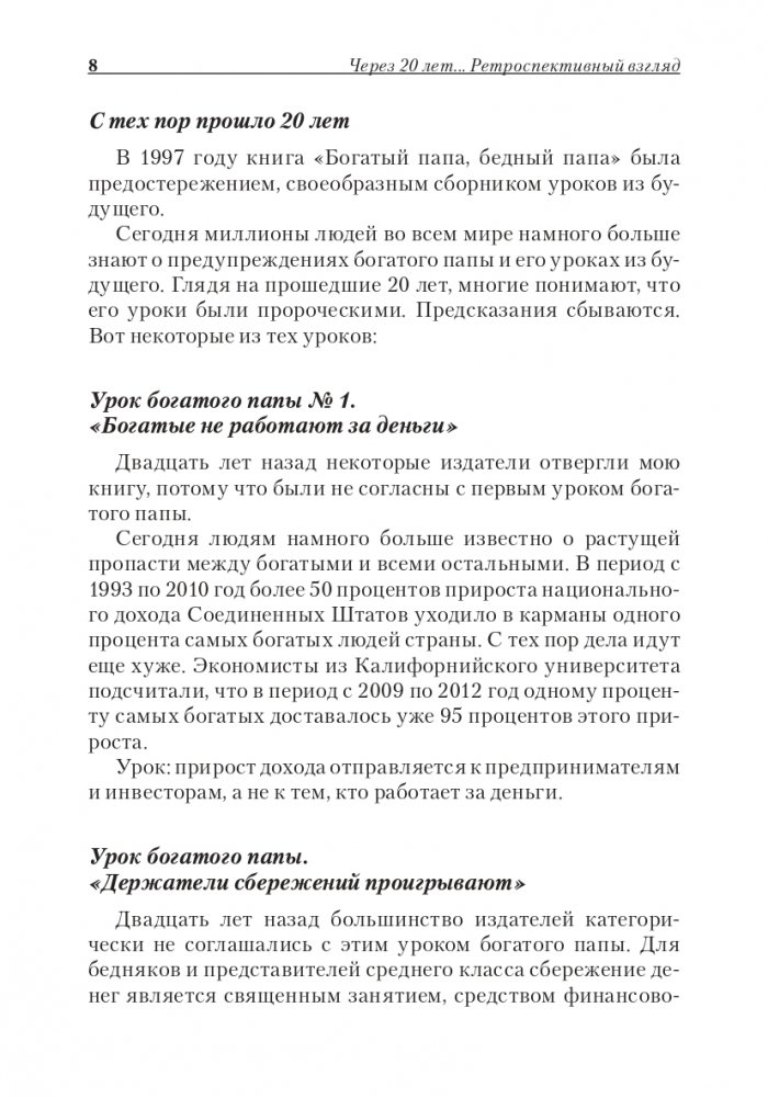 К 20-летию финансового бестселлера всех времен Роберт Кийосаки порадовал читателей новым изданием ставшей уже культовой книги — с изменениями и дополнениями для сегодняшнего мира, сегодняшних рыночных условий и 9 новыми разделами. К сожалению, за последних 20 лет в сфере образования мало что поменялось — в школе наши дети до сих пор не получают никаких финансовых знаний и потом всю жизнь работают ради денег, вместо того чтобы заставить деньги работать на себя. Научите детей обращаться с деньгами раньше, чем они столкнутся с материальными трудностями в нашем нестабильном мире!