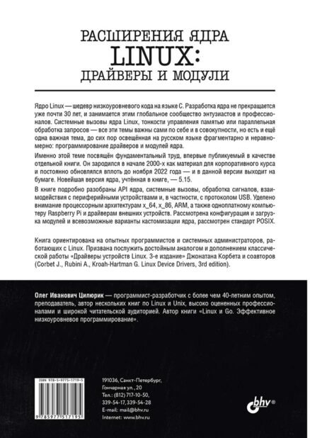 В книге подробно рассмотрено программирование драйверов ядра Linux, исследованы возможности расширяемости ядра при помощи модулей. Основная версия ядра – 5.15. Код примеров отработан и проверен на десятках различных инсталляций Linux, установленных из различных дистрибутивов и разных семейств дистрибутивов: Fedora, CentOS, Debian, Ubuntu, Mint. Уделено внимание архитектурам x_64, x_86, ARM, а также одноплатному компьютеру Raspberry Pi и драйверам устройств, подключаемых по USB. Затронут стандарт POSIX, разобраны API ядра, работа с Raspberry Pi, системные вызовы и подключение разнообразных периферийных устройств.