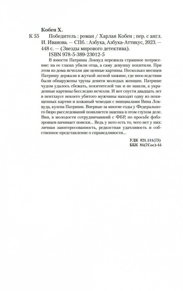 В юности Патриша Локвуд пережила страшное потрясение: на ее глазах убили отца, а саму девушку похитили. При этом из дома исчезли две ценные картины. Несколько месяцев Патришу держали в жуткой лесной хижине, где впоследствии были обнаружены трупы девяти молодых женщин. Патрише чудом удалось сбежать, похитителей так и не нашли, а украденные картины бесследно исчезли. И вот спустя двадцать лет в пентхаусе некоего убитого мужчины находят одну из похищенных картин и кожаный чемодан с инициалами Вина Локвуда, кузена Патриши. Впервые за многие годы у Федерального бюро расследований появляется зацепка в этом глухом деле. Вин, в молодости сотрудничавший с ФБР, по просьбе фэбээровцев начинает поиски… Ведь у него есть то, чего нет у них: личная заинтересованность, редкостная удачливость и собственное представление о справедливости…