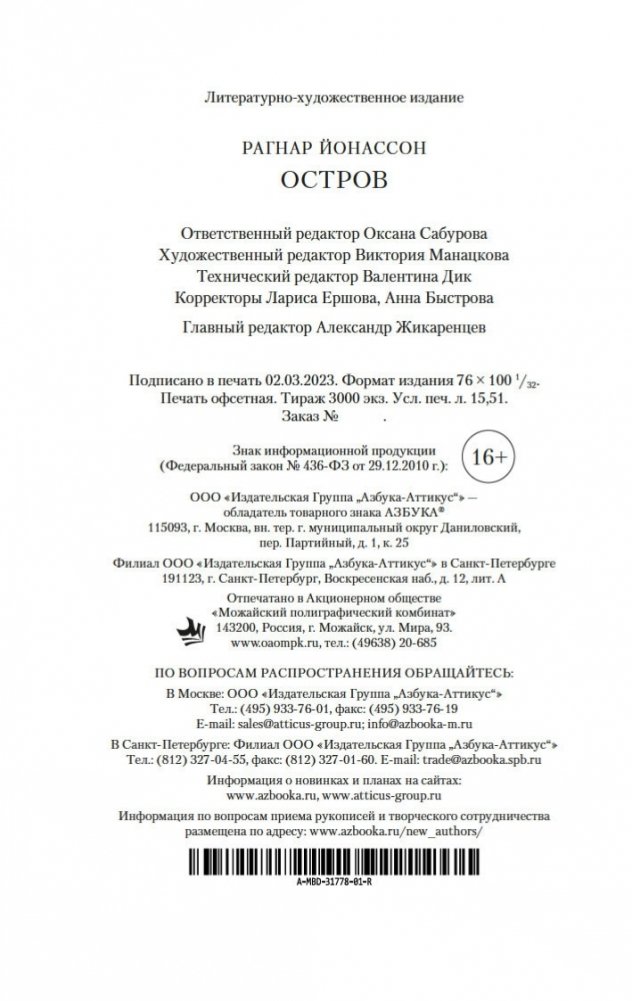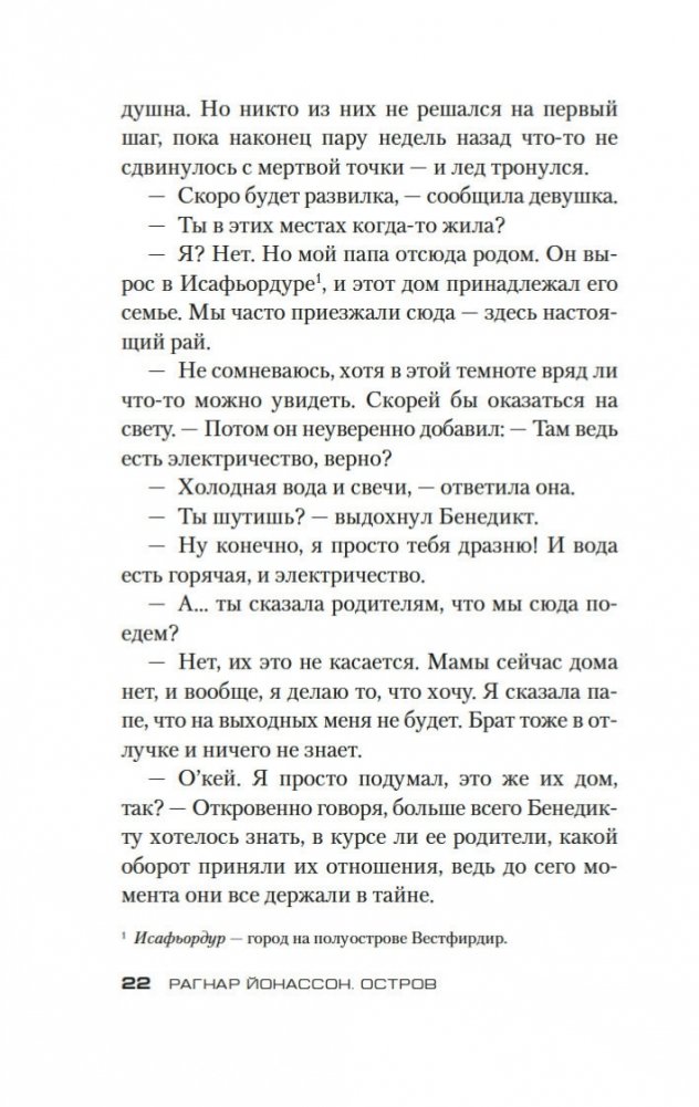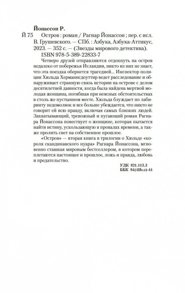 Четверо друзей отправляются отдохнуть на остров недалеко от побережья Исландии, никто из них не знает, что эта поездка обернется трагедией... Инспектор полиции Хюльда Херманнсдоуттир ведет расследование и обнаруживает странную связь истории на острове с делом десятилетней давности, когда была найдена мертвой молодая женщина, погибшая при неясных обстоятельствах в столь же пустынном месте. Хюльда блуждает по лабиринту недомолвок и все больше убеждается, что никто не говорит ей всю правду, включая самых близких людей. Захватывающий, тревожный и пугающий роман Рагнара Йонассона повествует о женщине, которая пытается найти истину, ускользающую в провалах времени, а также пролить свет на собственное прошлое. «Остров» — вторая книга в трилогии о Хюльде «короля скандинавского нуара» Рагнара Йонассона, мгновенно ставшая мировым бестселлером, в котором переплетаются настоящее и прошлое, ложь и правда, любовь и предательство.