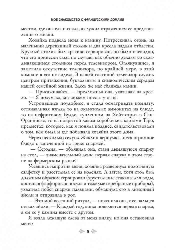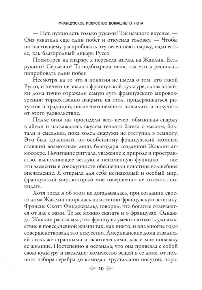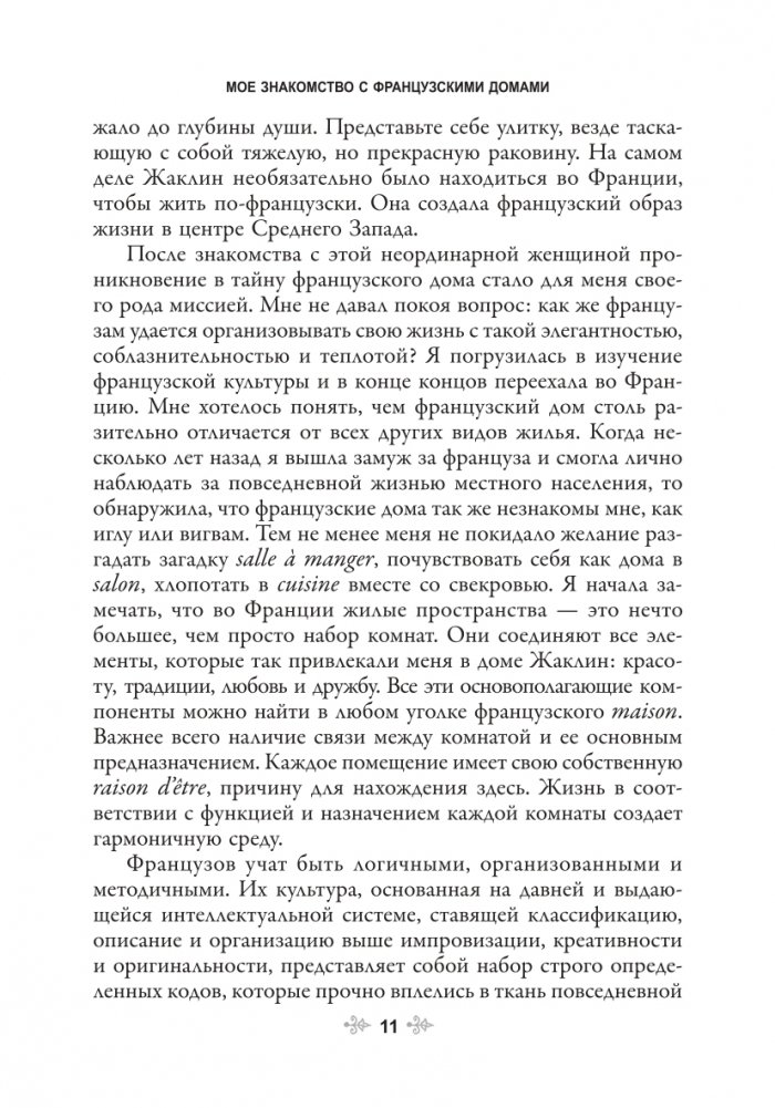 В книге даются подробные рекомендации, как обустроить прихожую или создать собственную гостиную (salon) во французском духе, чем наполнить помещение, как расположить мебель, каких ритуалов придерживаться, приглашая в дом гостей.