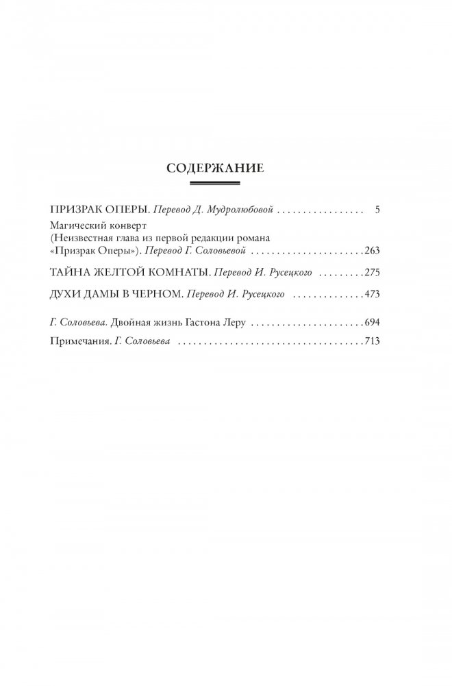 Гастон Леру — классик детективного и мистического романа. Вот уже более века по его книгам снимаются фильмы и сериалы, ставятся спектакли и мюзиклы. Особенно прославился в этом плане один из самых известных французских романов всех времен — «Призрак Оперы». Эта захватывающая готическая история о загадочном существе, обитающем в подземельях знаменитой Парижской оперы, до сих пор способна держать в напряжении читателя от первой до последней страницы. В настоящее издание, помимо «Призрака Оперы», вошли первые, и самые известные, романы о приключениях репортера Жозефа Рультабийля: «Тайна Желтой комнаты» (Джон Диксон Карр считал «Тайну...» лучшей историей о преступлении в герметично замкнутом пространстве) и «Духи дамы в черном». Также в книгу включена никогда не переводившаяся на русский язык дополнительная глава к «Призраку Оперы», входившая в первую редакцию романа.