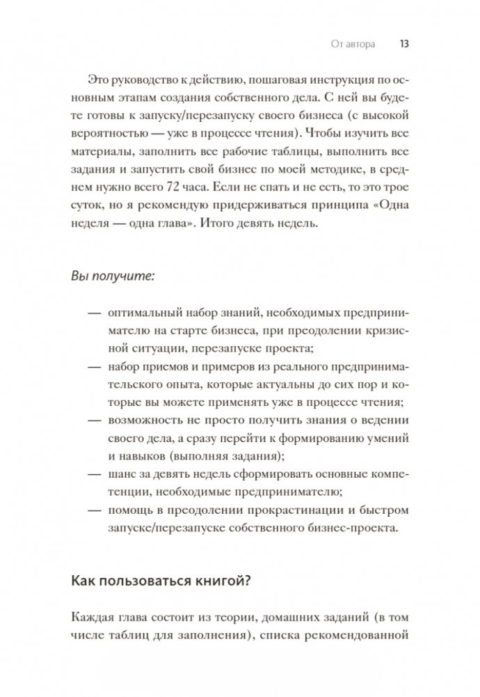 Это руководство к действию, пошаговая инструкция по основным этапам создания собственного дела. С ней вы будете готовы к запуску/перезапуску своего бизнеса (с высокой вероятностью — уже в процессе чтения). Чтобы изучить все материалы, заполнить все рабочие таблицы, выполнить все задания и запустить свой бизнес по моей методике, в среднем нужно всего 72 часа. Если не спать и не есть, то это трое суток, но я рекомендую придерживаться принципа "Одна неделя — одна глава". Итого девять недель.