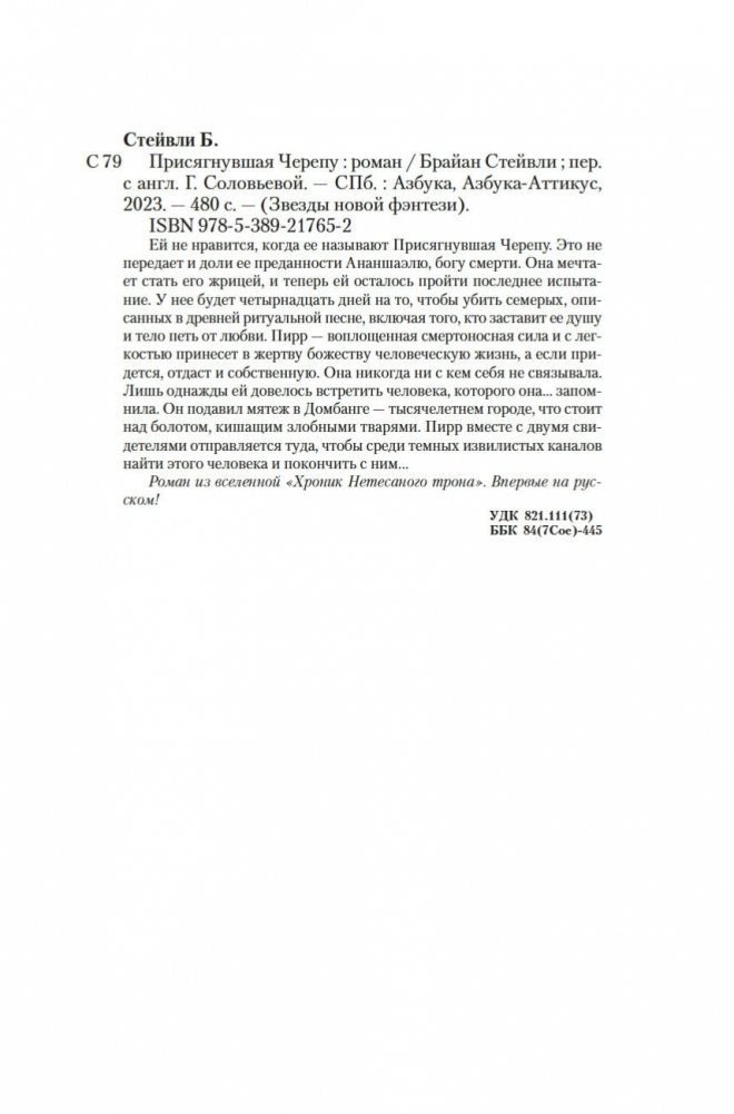 Ей не нравится, когда ее называют Присягнувшая Черепу. Это не передает и доли ее преданности Ананшаэлю, богу смерти. Она мечтает стать его жрицей, и теперь ей осталось пройти последнее испытание. У нее будет четырнадцать дней на то, чтобы убить семерых, описанных в древней ритуальной песне, включая того, кто заставит ее душу и тело петь от любви. Пирр — воплощенная смертоносная сила и с легкостью принесет в жертву божеству человеческую жизнь, а если придется, отдаст и собственную. Она никогда ни с кем себя не связывала. Лишь однажды ей довелось встретить человека, которого она... запомнила. Он подавил мятеж в Домбанге — тысячелетнем городе, что стоит над болотом, кишащим злобными тварями. Пирр вместе с двумя свидетелями отправляется туда, чтобы среди темных извилистых каналов найти этого человека и покончить с ним... Роман из вселенной «Хроник Нетесаного трона». Впервые на русском!
