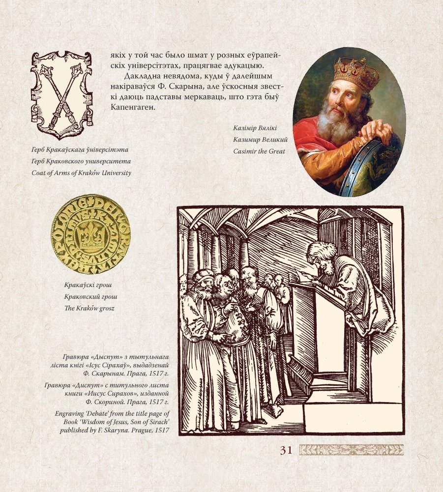 Кніга багата ілюстравана старажытнымі гравюрамі, фотаздымкамі выдатных мясцін, партрэтамі асоб, з якімі перасякаўся Скарынаў лёс, а таксама творамі мастацтва. У выданні выкарыстаны матэрыялы з фондаў Дзяржаўнай публічнай бібліятэкі імя М. Я. Салтыкова-Шчадрына (цяпер Расійская нацыянальная бібліятэка) і Дзяржаўнага Эрмітажа (Санкт-Пецярбург, Расія), Нацыянальнай бібліятэкі Беларусі. Прыцягваліся інтэрнэт-рэсурсы. Выданне адрасуецца шырокаму колу чытачоў. 2-е выданне, стэрэатыпнае.