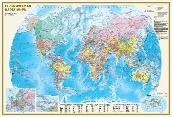 Двухсторонняя настенная карта размерами 1170х790 мм состоит из двух карт масштаба 1:32 000 000 (в 1 см 320 км). На физической карте мира благодаря удачно подобранной цветовой шкале высот и глубин с множеством градаций наглядно показан рельеф суши Земли и дна Мирового океана. Подробно отражена гидрологическая сеть материков. Приведены названия всех основных морфоструктурных форм земной поверхности (горных систем и хребтов, равнин, низменностей и пр.). Основная карта дополнена врезками на Арктику и Антарктиду, а также картами "Климатические пояса" и "Природные зоны суши". На Политической карте представлены все независимые государства мира, а также владения и территории с особым статусом. Россия представлена в новых границах: с Донецкой и Луганской Народными республиками, Запорожской и Херсонской областями, Республикой Крым и Севастополем. Хорошо различимыми пунсонами показаны населённые пункты с градациями "более 1 млн жителей", "от 100 тыс. до 1 млн жителей" и "менее 100 тыс. жителей". Основную карту дополняют врезки в более крупных масштабах на Европу и Карибский регион, а также карта "Плотность населения". В табличном виде приведены данные о крупнейших странах мира по населению, площади, а также об основных городских агломерациях мира. Карта упакована в прозрачный тубус (пакет с объёмным дном и еврослотом) из мягкого пластика. Размеры тубуса: длина 800 мм, диаметр 50 мм.
