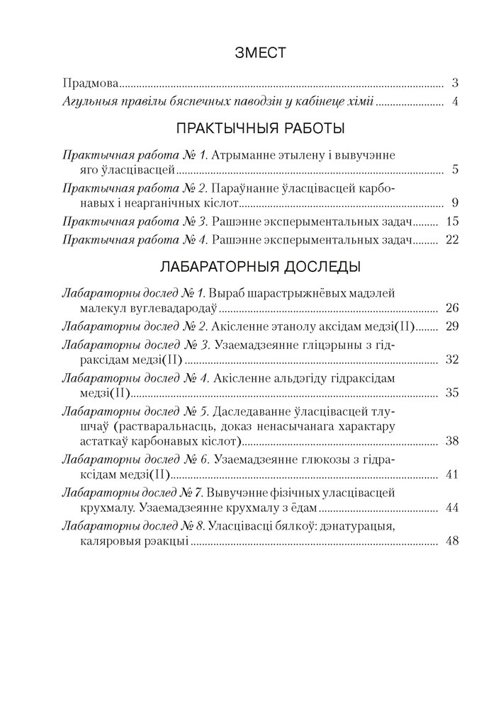 Сшытак з’яўляецца часткай вучэбна-метадычнага комплексу па хіміі для 10 класа. У ім змяшчаюцца практычныя работы і лабараторныя доследы, выкананне якіх прадугледжана вучэбнай праграмай (базавы ўзровень), прапануюцца рацыянальныя і эфектыўныя спосабы іх афармлення. Пасля кожнага лабараторнага доследу прыводзяцца рознаўзроўневыя заданні для самастойнага замацавання ведаў.