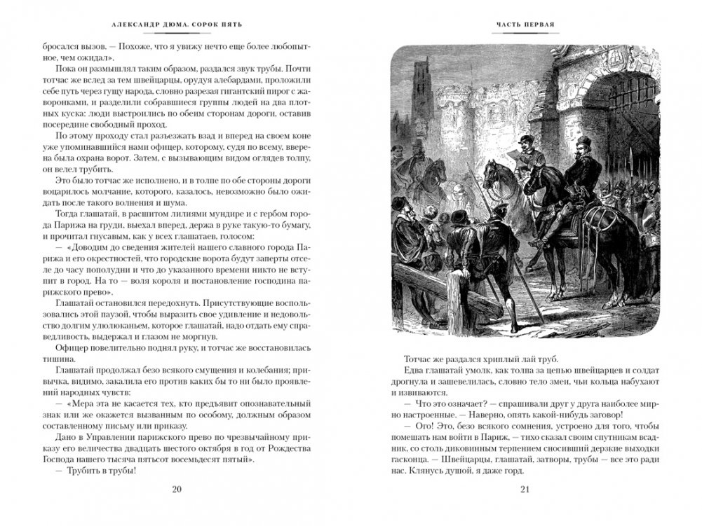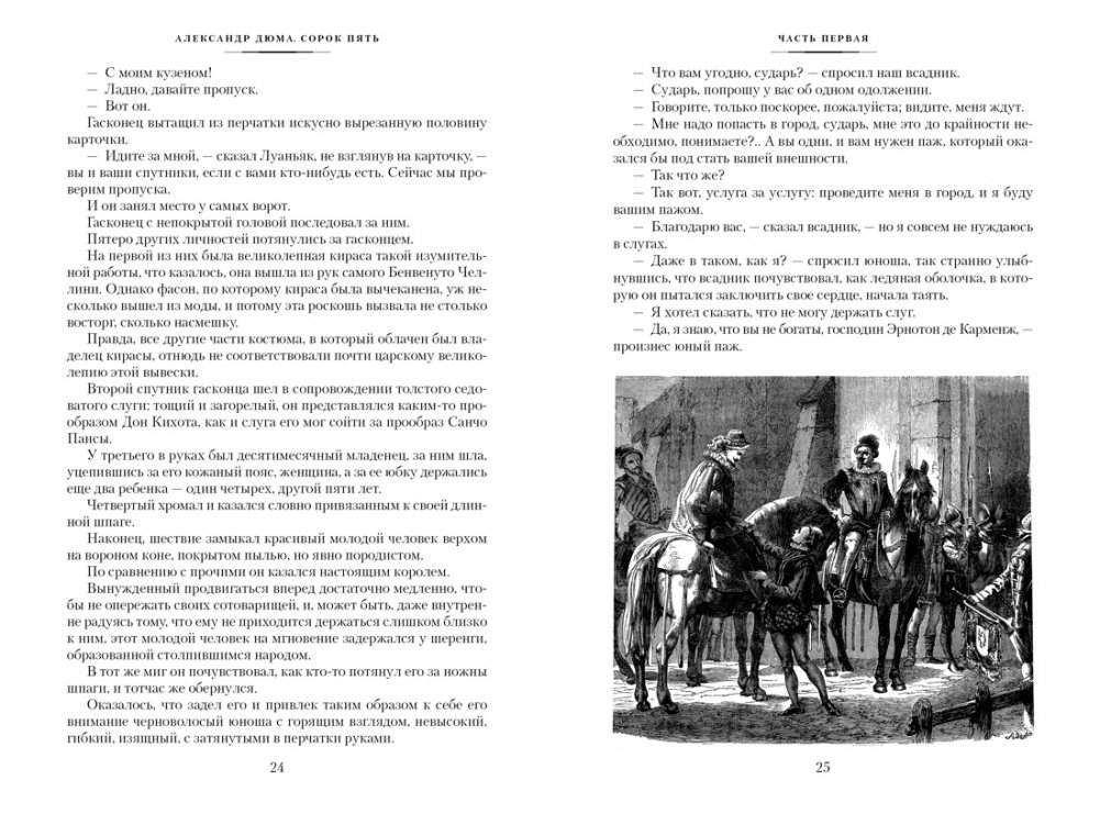 Александр Дюма — всемирно известный писатель, автор множества увлекательных исторических романов. Стремительное развитие событий, неожиданные повороты сюжета, придворные интриги, беспринципная борьба за власть, любовь и ненависть — все это читатель найдет и в романе «Сорок пять», посвященном гугенотским войнам конца XVI века. Королю Франции Генриху III грозит смертельная опасность. Жадные до власти Гизы нанимают целую армию убийц, и лишь сорок пять телохранителей, верных королю, еще способны спасти престол от кровавого преступления… В книге использованы иллюстрации французских художников XIX века Жан-Адольфа Боса, Эда Коппина, Альфонса де Невиля и американца Фрэнка Тэйера Мэррилла.