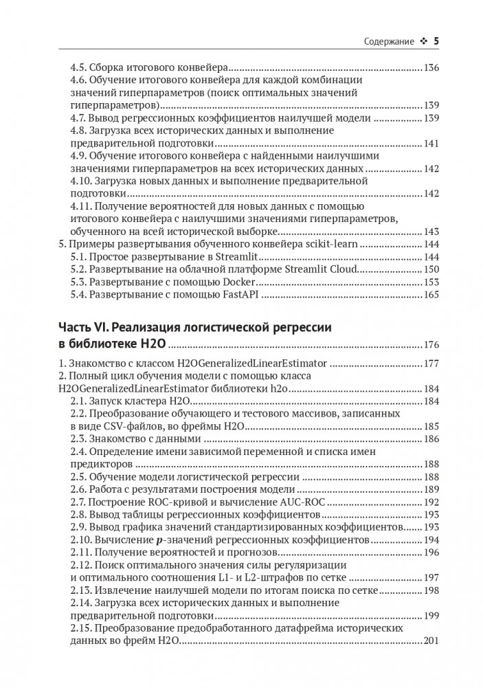 В книге рассказывается о математическом аппарате логистической регрессии, способах интерпретации регрессионных коэффициентов, даются программные реализации методов оценивания (метод градиентного спуска, метод Ньютона без регуляризации / с регуляризацией), приведены примеры развертывания моделей с помощью Streamlit, Streamlit Cloud, Docker, FastAPI и Flask.