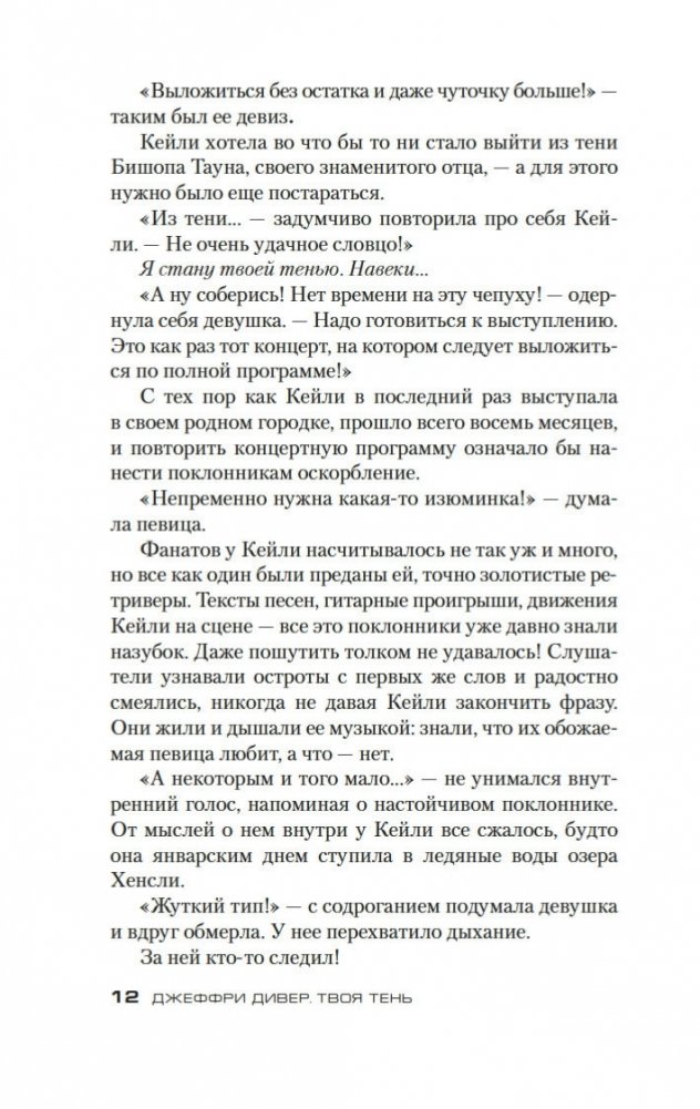 Музыкальная карьера певицы Кейли Таун набирает высоту благодаря огромной популярности хита «Твоя тень». Но у славы есть и другая сторона. Вступая в невинную переписку с одним из поклонников, Кейли не подозревает, чем это обернется. Тот считает, что ее песни содержат послания, обращенные лично к нему; он убежден, что «Твоя тень» была написана исключительно для него. Вскоре певице начинает казаться, что за ней кто-то следит. В концертном зале, где она репетирует, сначала происходит аварийная ситуация, жертвой которой едва не становится сама Кейли, а затем трагически погибает ее друг, участник группы. Случайно ли это? Впрочем, прямых улик против назойливого поклонника Кейли не найдено. Кроме того, расследующая это дело специальный агент Кэтрин Дэнс, эксперт по кинесике — языку тела, считает: если одержимый человек «верит во все свои выдумки, то кинесика тут бессильна и анализировать его поведение смысла нет». Тем временем события разворачиваются по непредсказуемому сценарию, смерть идет по пятам близких Кейли Таун, а потом и над ее головой нависает угроза...