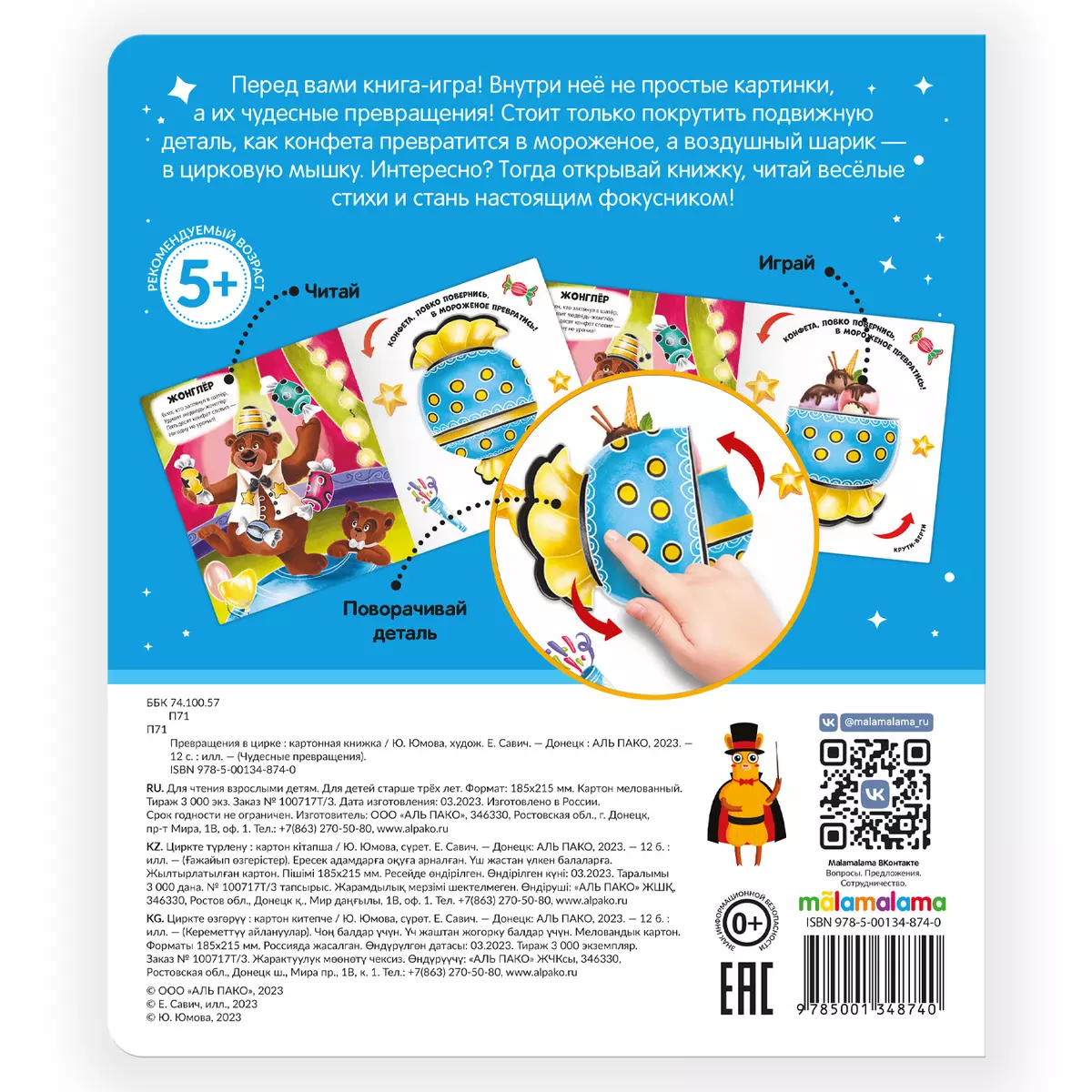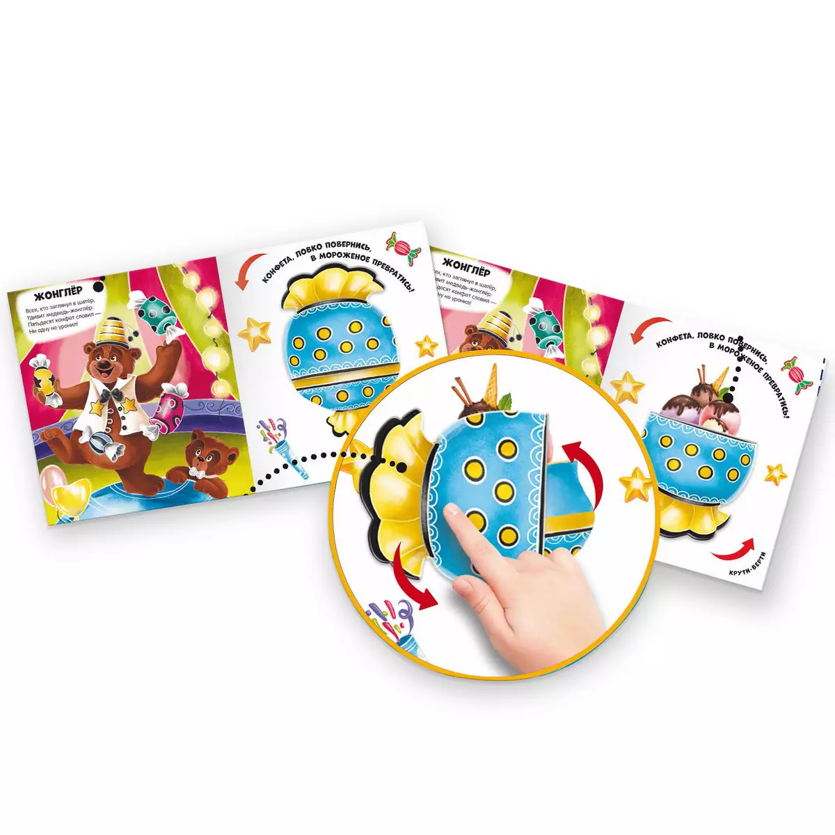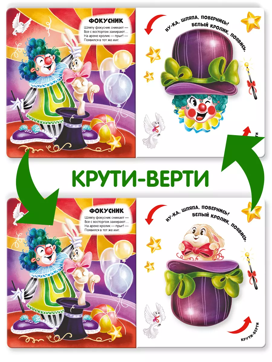 Перед вами книга-игра! Внутри неё не простые картинки, а их чудесные превращения! Стоит только покрутить подвижную деталь, как конфета превратится в мороженое, а воздушный шарик в цирковую мышку. Интересно? Тогда открывай книжку, читай весёлые стихи и стань настоящим фокусником!