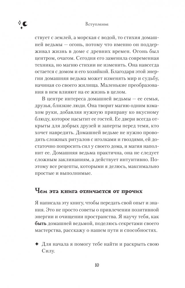 Книга-путеводитель в мир магии, которой вы так долго ждали. Ее автор — домашняя ведьма со стажем — познакомит вас с основами своего колдовства и раскроет несколько важных секретов. Первый и самый главный из них: стать ведьмой может каждая! Сила и природная мудрость уже струится внутри вас. Откройте книгу и узнайте, как направить этот мощный поток энергии на исполнение желаний, привлечение любви, изобилия и гармонии в вашу жизнь. В конце книги вас ждет колдовской гримуар, который содержит проверенные автором обряды и заклинания для юных ведьмочек и опытных ведьм.