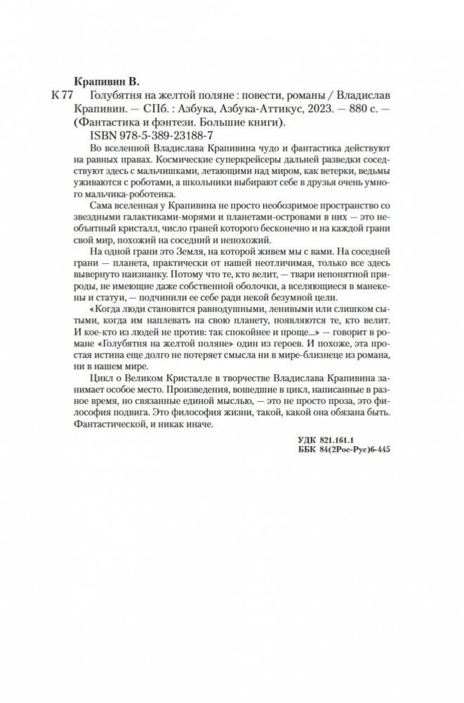 Во вселенной Владислава Крапивина чудо и фантастика действуют на равных правах. Космические суперкрейсеры дальней разведки соседствуют здесь с мальчишками, летающими над миром, как ветерки, ведьмы уживаются с роботами, а школьники выбирают себе в друзья очень умного мальчика-роботенка. Сама вселенная у Крапивина не просто необозримое пространство со звездными галактиками-морями и планетами-островами в них — это необъятный кристалл, число граней которого бесконечно и на каждой грани свой мир, похожий на соседний и непохожий. На одной грани это Земля, на которой живем мы с вами. На соседней грани — планета, практически от нашей неотличимая, только все здесь вывернуто наизнанку. Потому что те, кто велит, — твари непонятной природы, не имеющие даже собственной оболочки, а вселяющиеся в манекены и статуи, — подчинили ее себе ради некой безумной цели. «Когда люди становятся равнодушными, ленивыми или слишком сытыми, когда им наплевать на свою планету, появляются те, кто велит. И кое-кто из людей не против: так спокойнее и проще…» — говорит в романе «Голубятня на желтой поляне» один из героев. И похоже, эта простая истина еще долго не потеряет смысла ни в мире-близнеце из романа, ни в нашем мире. Цикл о Великом Кристалле в творчестве Владислава Крапивина занимает особое место. Произведения, вошедшие в цикл, написанные в разное время, но связанные единой мыслью, — это не просто проза, это философия подвига. Это философия жизни, такой, какой она обязана быть. Фантастической, и никак иначе.