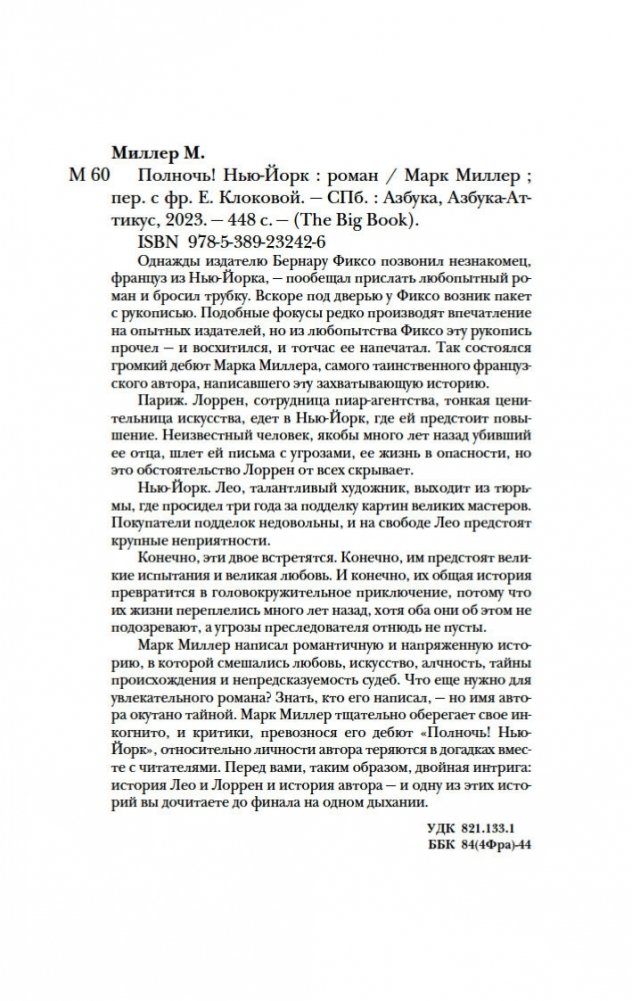 Однажды издателю Бернару Фиксо позвонил незнакомец, француз из Нью-Йорка, — пообещал прислать любопытный роман и бросил трубку. Вскоре под дверью у Фиксо возник пакет с рукописью. Подобные фокусы редко производят впечатление на опытных издателей, но из любопытства Фиксо эту рукопись прочел — и восхитился, и тотчас ее напечатал. Так состоялся громкий дебют Марка Миллера, самого таинственного французского автора, написавшего эту захватывающую историю. Париж. Лоррен, сотрудница пиар-агентства, тонкая ценительница искусства, едет в Нью-Йорк, где ей предстоит повышение. Неизвестный человек, якобы много лет назад убивший ее отца, шлет ей письма с угрозами, ее жизнь в опасности, но это обстоятельство Лоррен от всех скрывает. Нью-Йорк. Лео, талантливый художник, выходит из тюрьмы, где просидел три года за подделку картин великих мастеров. Покупатели подделок недовольны, и на свободе Лео предстоят крупные неприятности. Конечно, эти двое встретятся. Конечно, им предстоят великие испытания и великая любовь. И конечно, их общая история превратится в головокружительное приключение, потому что их жизни переплелись много лет назад, хотя оба они об этом не подозревают, а угрозы преследователя отнюдь не пусты. Марк Миллер написал романтичную и напряженную историю, в которой смешались любовь, искусство, алчность, тайны происхождения и непредсказуемость судеб. Что еще нужно для увлекательного романа? Знать, кто его написал, — но имя автора окутано тайной. Марк Миллер тщательно оберегает свое инкогнито, и критики, превознося его дебют «Полночь! Нью-Йорк», относительно личности автора теряются в догадках вместе с читателями. Перед вами, таким образом, двойная интрига: история Лео и Лоррен и история автора — и одну из этих историй вы дочитаете до финала на одном дыхании.