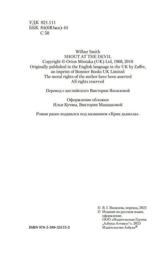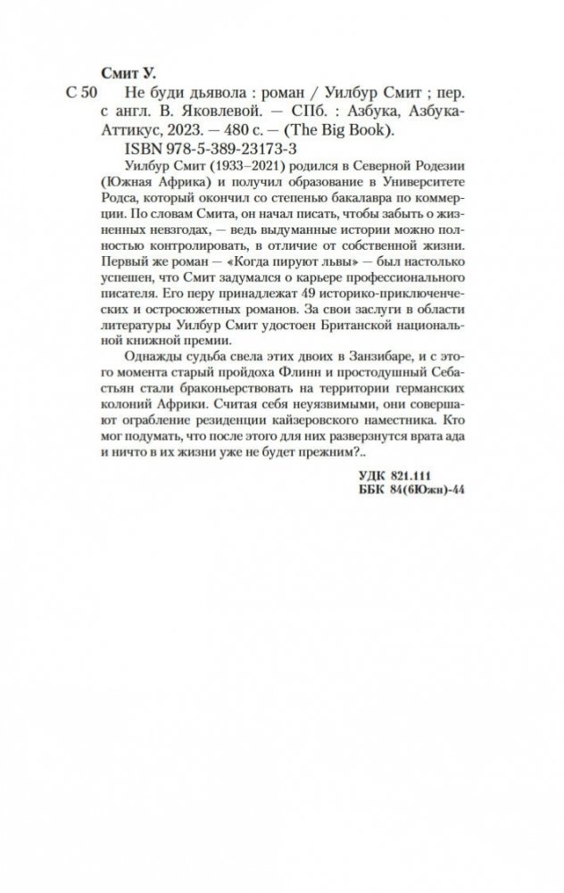 Уилбур Смит (1933–2021) родился в Северной Родезии (Южная Африка) и получил образование в Университете Родса, который окончил со степенью бакалавра по коммерции. По словам Смита, он начал писать, чтобы забыть о жизненных невзгодах, — ведь выдуманные истории можно полностью контролировать, в отличие от собственной жизни. Первый же роман — «Когда пируют львы» — был настолько успешен, что Смит задумался о карьере профессионального писателя. Его перу принадлежат 49 историко-приключенческих и остросюжетных романов. За свои заслуги в области литературы Уилбур Смит удостоен Британской национальной книжной премии. Однажды судьба свела этих двоих в Занзибаре, и с этого момента старый пройдоха Флинн и простодушный Себастьян стали браконьерствовать на территории германских колоний Африки. Считая себя неуязвимыми, они совершают ограбление резиденции кайзеровского наместника. Кто мог подумать, что после этого для них разверзнутся врата ада и ничто в их жизни уже не будет прежним?..