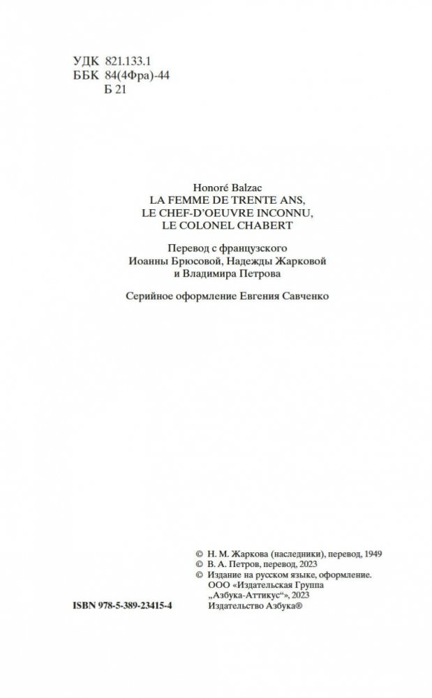 Знаменитый роман Оноре де Бальзака «Тридцатилетняя женщина» относится к разделу «Сцены из частной жизни» масштабного цикла «Человеческая комедия», и именно благодаря ему родилось крылатое выражение «женщина бальзаковского возраста». Работа над текстом романа, составленного из самостоятельных рассказов, часть которых прежде публиковалась в журналах, продлилась более десяти лет. В последовательно расположенных рассказах автор разворачивает перед читателем историю жизни Жюли д’Эглемон, которую на первых страницах мы встречаем юной девушкой, без памяти влюбленной в будущего супруга. Наблюдая за судьбой героини, автор размышляет о природе любви между мужчиной и женщиной и родительской любви, о современном браке и современном обществе. В настоящем издании роман «Тридцатилетняя женщина» публикуется в новом переводе. Помимо него в сборник включены два других знаменитых произведения из цикла «Человеческая комедия»: новеллы «Неведомый шедевр» и «Полковник Шабер».