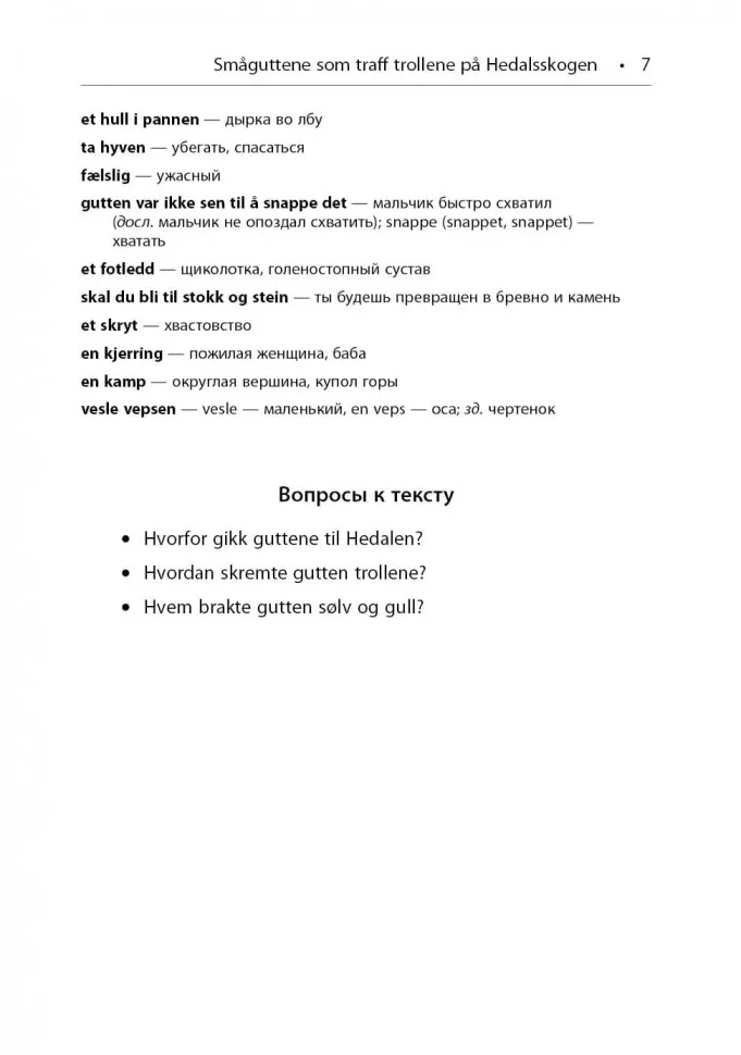 В книге тексты сказок на норвежском языке дополняют их художественные переводы на русский язык. Вопросы к текстам, а также слова и выражения к ним помогут читателю яснее понять содержание сказки, закрепить в памяти распространенные грамматические формы и пополнить словарный запас.