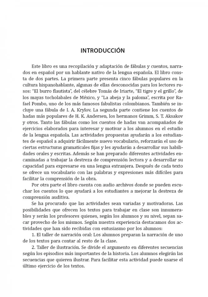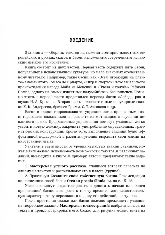 Сборник включает сказки и басни, большая часть из них знакома читателям с детства. Адаптированные тексты сопровождаются упражнениями, которые помогут изучающим испанский язык с легкостью усвоить новую лексику, закрепить употребление некоторых грамматических конструкций, будут полезны для развития навыков устной и письменной речи. Задания к текстам учитель может использовать для контроля понимания прочитанного и организации самостоятельной творческой работы школьников.