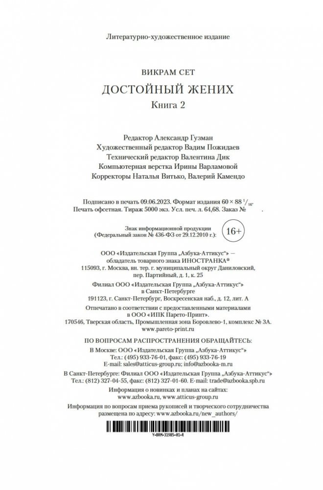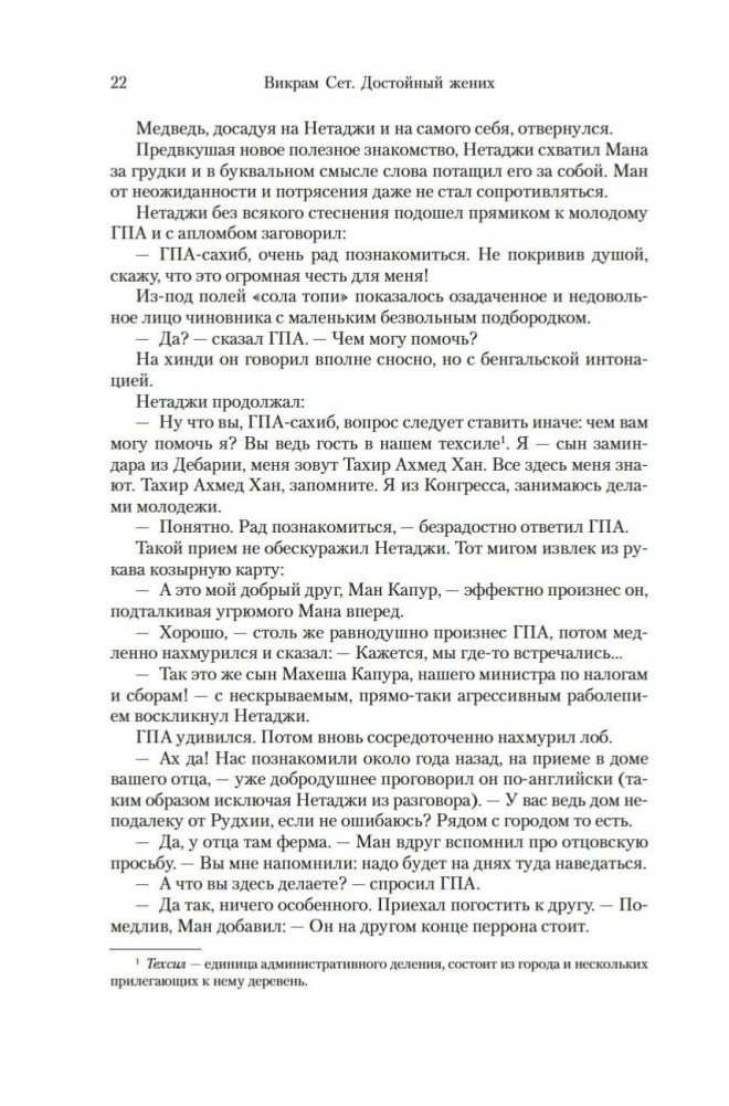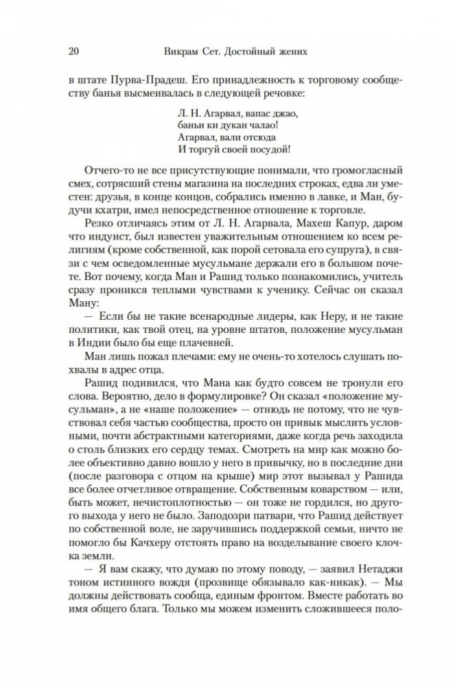 Современный классик Викрам Сет — настоящий гражданин мира. Родился в Индии, учился в Оксфорде, а также в Стэнфордском университете в Калифорнии, где вместо диссертации по экономике написал свой первый роман «Золотые Ворота» об американских яппи — и это был роман в стихах; более того, от начала до конца написанный онегинской строфой. А через много лет работы вышел и «Достойный жених» — «эпопея, многофигурная, как романы Диккенса или Троллопа, и необъятная, как сама Индия» (San Francisco Chronicle), рекордная по многим показателям: самый длинный в истории английской литературы роман, какой удавалось опубликовать одним томом; переводы на три десятка языков и всемирный тираж, достигший 26 миллионов экземпляров. Действие происходит в вымышленном городе Брахмпур на берегу Ганга вскоре после обретения Индией независимости; госпожа Рупа Мера, выдав замуж старшую дочь Савиту, пытается найти достойного жениха для младшей дочери, студентки Латы, — а та, как девушка современная, имеет свое мнение на этот счет и склонна слушать не старших, а свое сердце. Теперь ей предстоит выбрать из трех ухажеров — сверстника-студента Кабира, знаменитого поэта Амита и Хареша, восходящей звезды обувного бизнеса... В 2020 году первый канал Би-би-си выпустил по роману мини-сериал, известный по-русски как «Подходящий жених»; постановщиком выступила Мира Наир («Ярмарка тщеславия», «Нью-Йорк, я люблю тебя»), а сценарий написал прославленный Эндрю Дэвис («Отверженные», «Война и мир», «Возвращение в Брайдсхед», «Нортэнгерское аббатство», «Разум и чувства»).