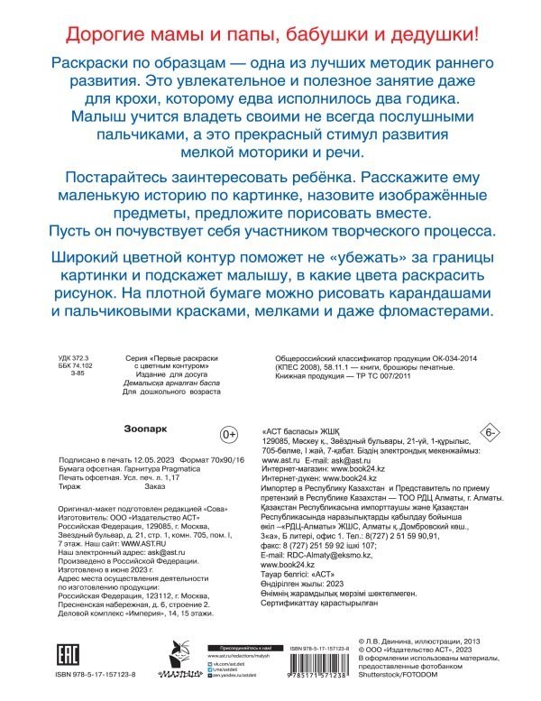 Развивающая раскраска "Зоопарк" — прекрасный подарок для маленьких художников, которые только учатся держать в руке карандаш или фломастер. Это крупные изображения животных с широким цветным контуром и образцами для раскрашивания. Малыш разовьёт мелкую моторику и координацию движений руки, зрительное восприятие и внимание.