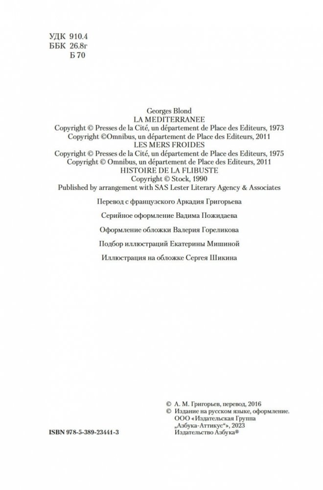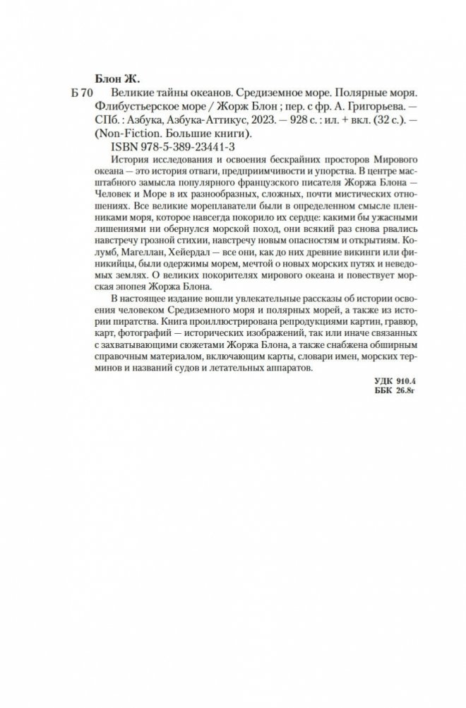 История исследования и освоения бескрайних просторов Мирового океана — это история отваги, предприимчивости и упорства. В центре масштабного замысла популярного французского писателя Жоржа Блона — Человек и Море в их разнообразных, сложных, почти мистических отношениях. Все великие мореплаватели были в определенном смысле пленниками моря, которое навсегда покорило их сердце: какими бы ужасными лишениями ни обернулся морской поход, они всякий раз снова рвались навстречу грозной стихии, навстречу новым опасностям и открытиям. Колумб, Магеллан, Хейердал — все они, как до них древние викинги или финикийцы, были одержимы морем, мечтой о новых морских путях и неведомых землях. О великих покорителях мирового океана и повествует морская эпопея Жоржа Блона. В настоящее издание вошли увлекательные рассказы об истории освоения человеком Средиземного моря и полярных морей, а также из истории пиратства. Книга проиллюстрирована репродукциями картин, гравюр, карт, фотографий — исторических изображений, так или иначе связанных с захватывающими сюжетами Жоржа Блона, а также снабжена обширным справочным материалом, включающим карты, словари имен, морских терминов и названий судов и летательных аппаратов.