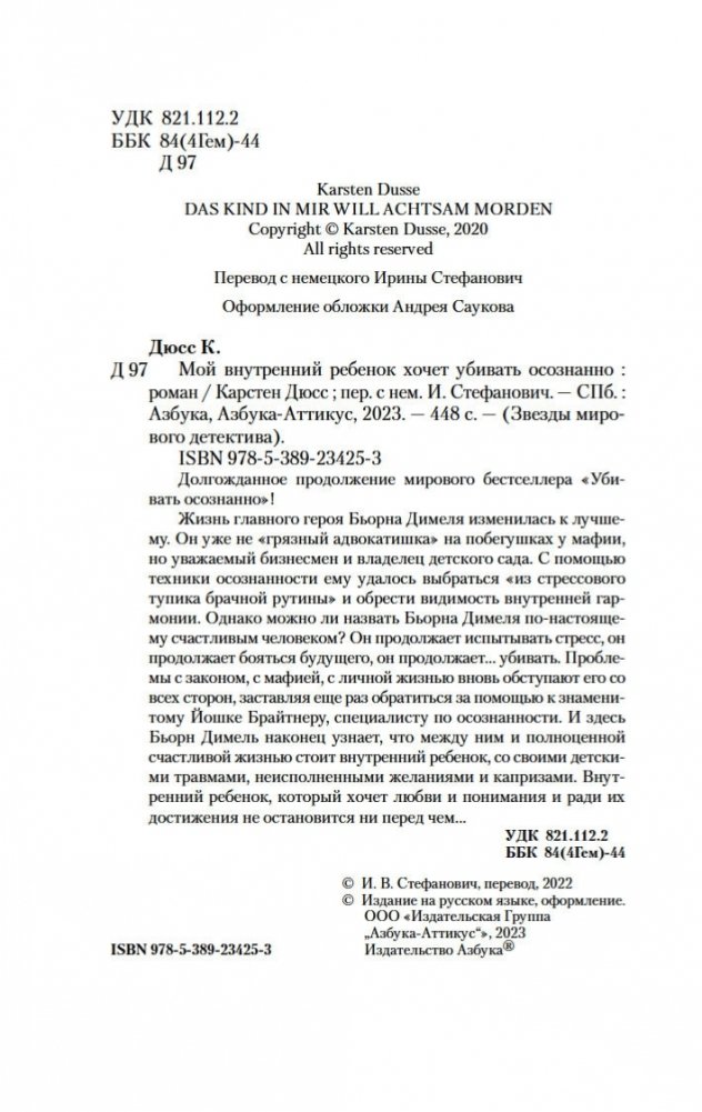 Долгожданное продолжение мирового бестселлера «Убивать осознанно»! Жизнь главного героя Бьорна Димеля изменилась к лучшему. Он уже не «грязный адвокатишка» на побегушках у мафии, но уважаемый бизнесмен и владелец детского сада. С помощью техники осознанности ему удалось выбраться «из стрессового тупика брачной рутины» и обрести видимость внутренней гармонии. Однако можно ли назвать Бьорна Димеля по-настоящему счастливым человеком? Он продолжает испытывать стресс, он продолжает бояться будущего, он продолжает… убивать. Проблемы с законом, с мафией, с личной жизнью вновь обступают его со всех сторон, заставляя еще раз обратиться за помощью к знаменитому Йошке Брайтнеру, специалисту по осознанности. И здесь Бьорн Димель наконец узнает, что между ним и полноценной счастливой жизнью стоит внутренний ребенок, со своими детскими травмами, неисполненными желаниями и капризами. Внутренний ребенок, который хочет любви и понимания и ради их достижения не остановится ни перед чем...