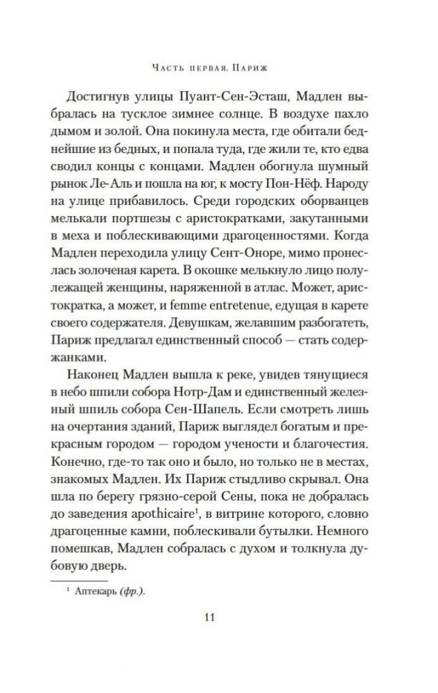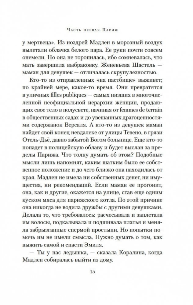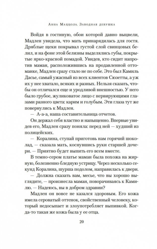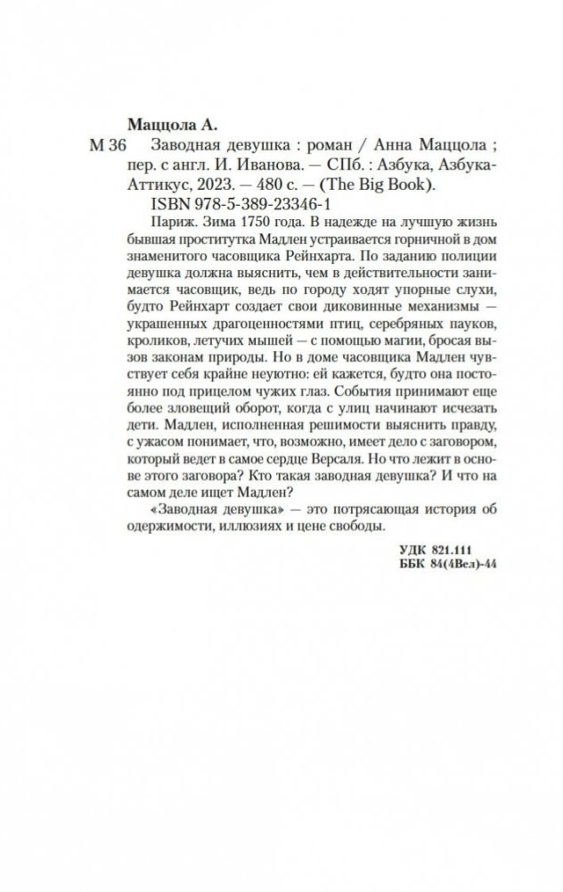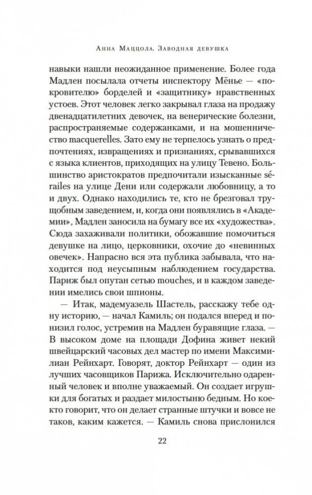 Париж. Зима 1750 года. В надежде на лучшую жизнь бывшая проститутка Мадлен устраивается горничной в дом знаменитого часовщика Рейнхарта. По заданию полиции девушка должна выяснить, чем в действительности занимается часовщик, ведь по городу ходят упорные слухи, будто Рейнхарт создает свои диковинные механизмы — украшенных драгоценностями птиц, серебряных пауков, кроликов, летучих мышей — с помощью магии, бросая вызов законам природы. Но в доме часовщика Мадлен чувствует себя крайне неуютно: ей кажется, будто она постоянно под прицелом чужих глаз. События принимают еще более зловещий оборот, когда с улиц начинают исчезать дети. Мадлен, исполненная решимости выяснить правду, с ужасом понимает, что, возможно, имеет дело с заговором, который ведет в самое сердце Версаля. Но что лежит в основе этого заговора? Кто такая заводная девушка? И что на самом деле ищет Мадлен? «Заводная девушка» — это потрясающая история об одержимости, иллюзиях и цене свободы.