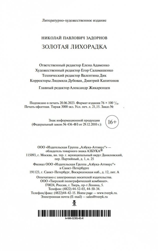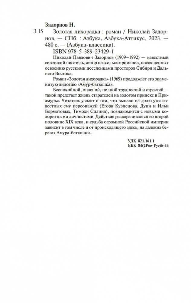 Николай Павлович Задорнов (1909–1992) — известный советский писатель, автор нескольких романов, посвященных освоению русскими поселенцами просторов Сибири и Дальнего Востока. Роман «Золотая лихорадка» (1969) продолжает его знаменитую дилогию «Амур-батюшка». Беспокойной, опасной, полной трудностей и страстей — такой предстает жизнь старателей на золотом прииске в Приамурье. Читатель узнает о том, что выпало на долю уже известных ему персонажей (Егора Кузнецова, Дуни и Ильи Бормотовых, Тимохи Силина), познакомится с новыми колоритными личностями. Действие разворачивается во второй половине XIX века, и судьба огромной Российской империи зависит в том числе и от происходящего здесь, на далеких берегах Амура-батюшки...