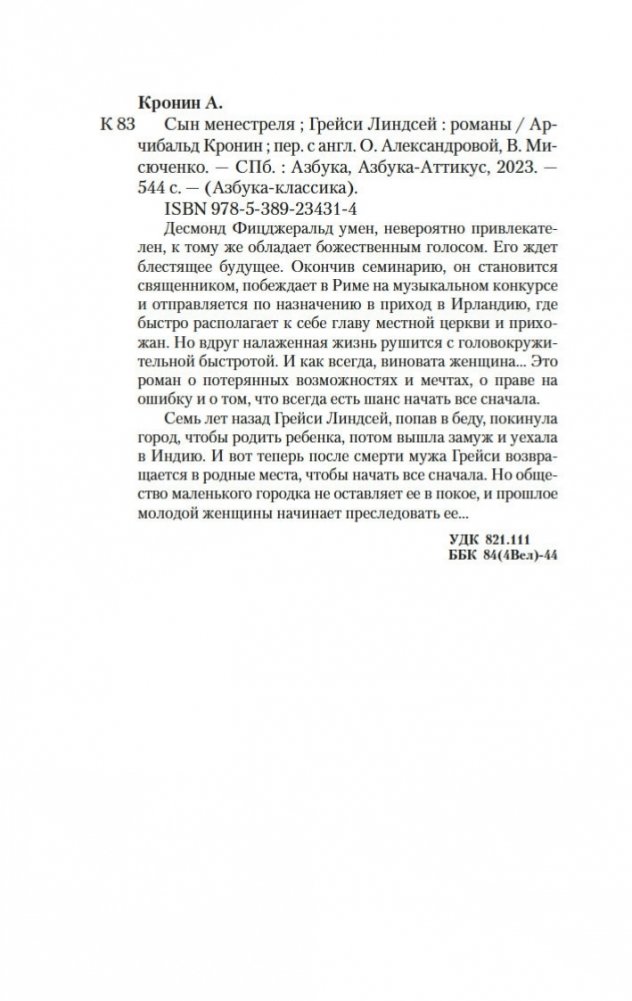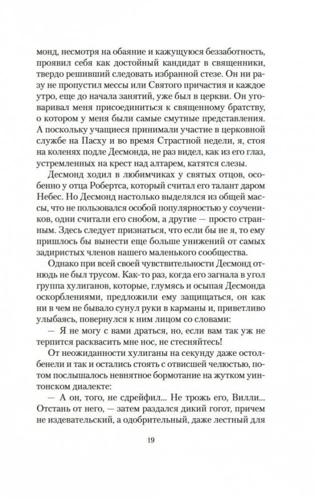 Десмонд Фицджеральд умен, невероятно привлекателен, к тому же обладает божественным голосом. Его ждет блестящее будущее. Окончив семинарию, он становится священником, побеждает в Риме на музыкальном конкурсе и отправляется по назначению в приход в Ирландию, где быстро располагает к себе главу местной церкви и прихожан. Но вдруг налаженная жизнь рушится с головокружительной быстротой. И как всегда, виновата женщина... Это роман о потерянных возможностях и мечтах, о праве на ошибку и о том, что всегда есть шанс начать все сначала. Семь лет назад Грейси Линдсей, попав в беду, покинула город, чтобы родить ребенка, потом вышла замуж и уехала в Индию. И вот теперь после смерти мужа Грейси возвращается в родные места, чтобы начать все сначала. Но общество маленького городка не оставляет ее в покое, и прошлое молодой женщины начинает преследовать ее…