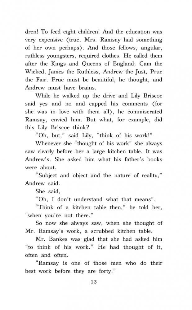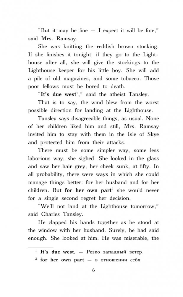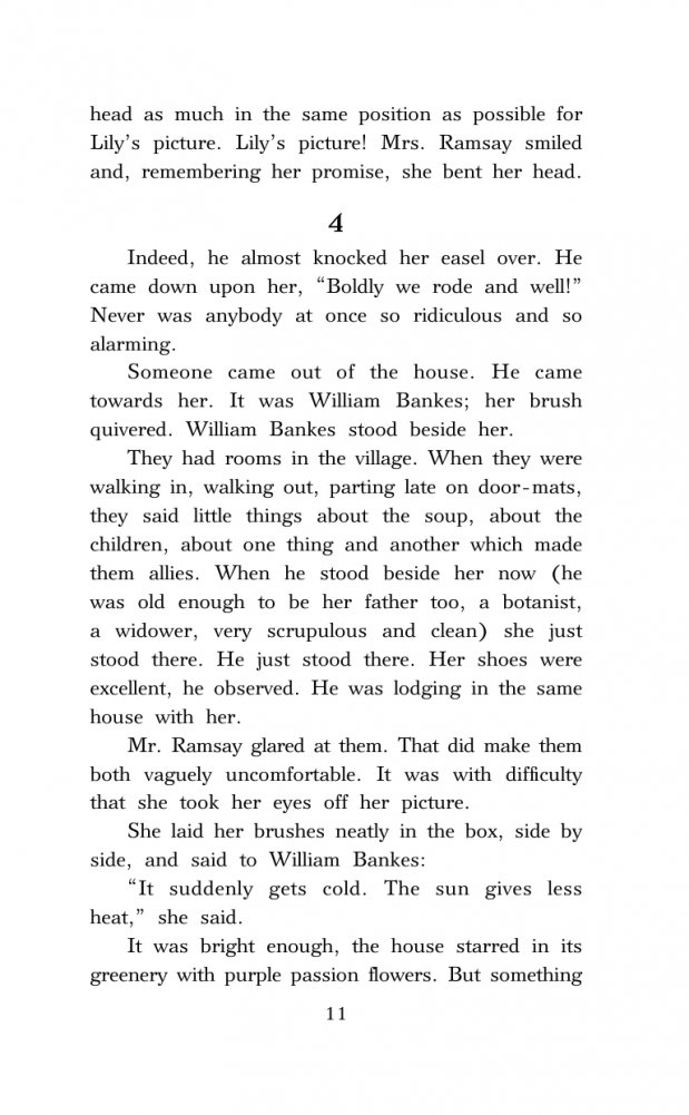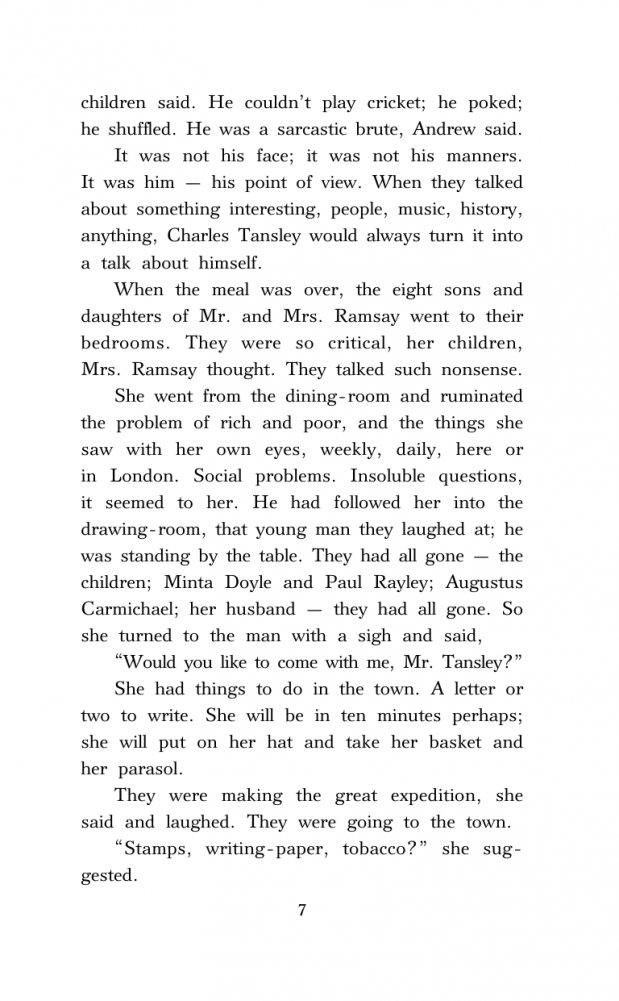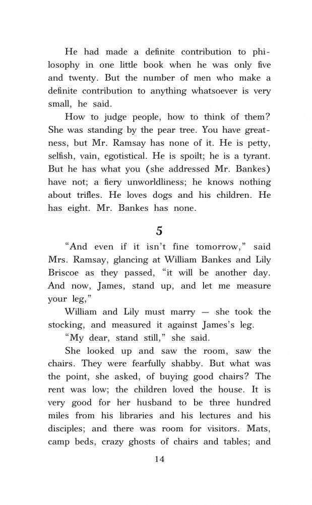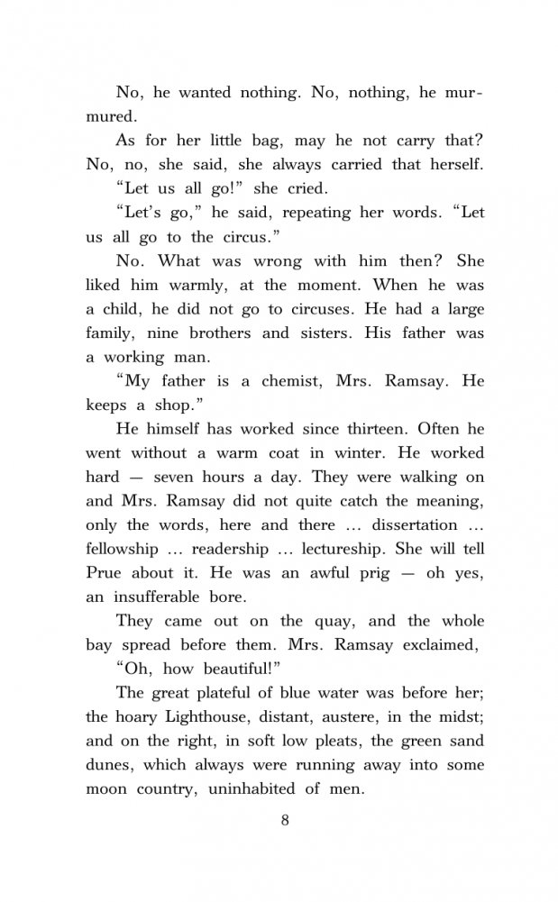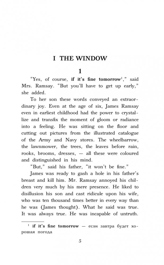 "Мама, мы поедем завтра на маяк?" У мистера и миссис Рэмзи восемь детей. Миссис Рэмзи любит детей и мужа, всегда рада гостям, обходительна и ласкова. "Конечно, дорогой, если погода будет хорошей". Миссис Рэмзи знает простую мудрость: людям нужны сочувствие и любовь. "Вот только, — говорит отец, — хорошей погода не будет". В этом и заключается человечность.
