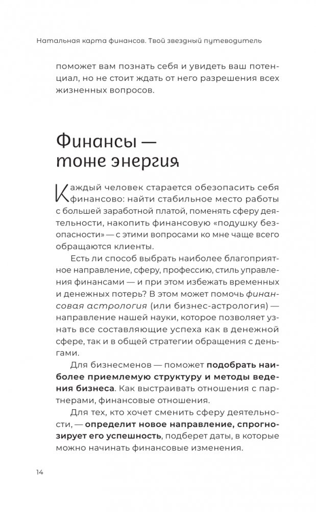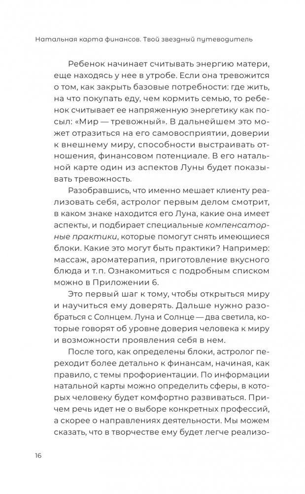 Прочитав эту книгу, вы узнаете, как с помощью астрологии выбрать направление, сферу или профессию, которые будут приносить стабильный и большой доход. Подберёте подходящую вам структуру и методы ведения бизнеса. Преодолеете внутренние и внешние ограничения, которые мешают вам выйти на новый финансовый уровень. А ещё — научитесь строить и читать натальную карту и использовать все её подсказки.