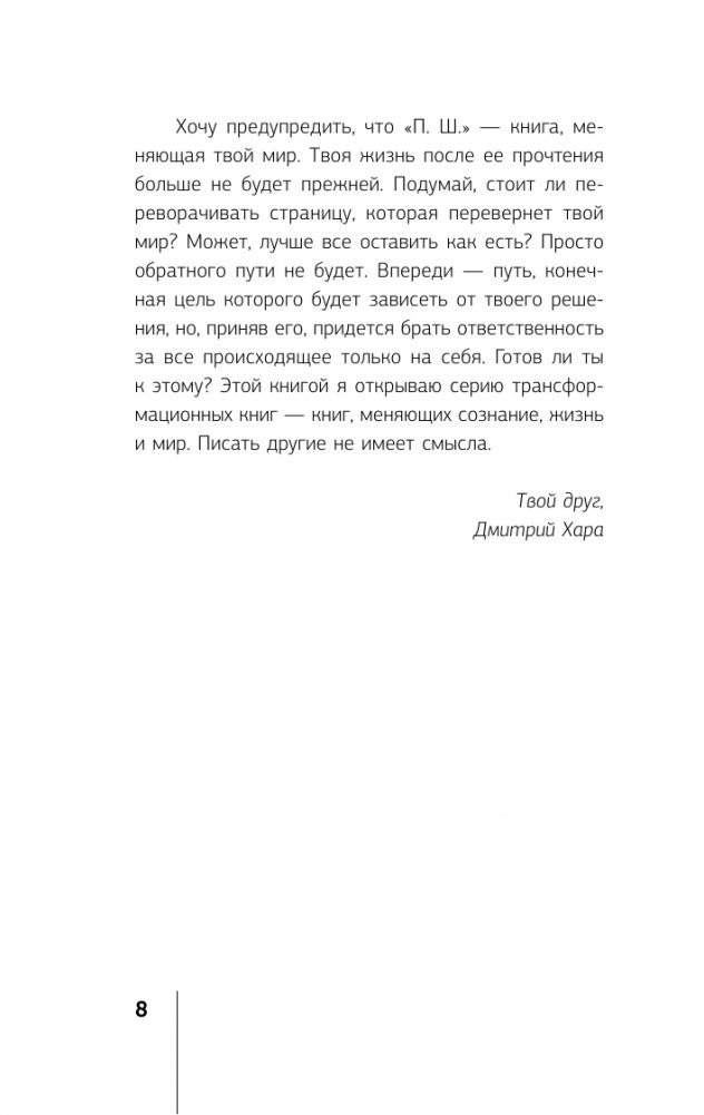 «Хочу предупредить, что „П. Ш.“ — книга, меняющая твой мир. Твоя жизнь после ее прочтения больше не будет прежней. Подумай, стоит ли переворачивать страницу, которая перевернет твой мир? Может, лучше все оставить как есть? Просто обратного пути не будет. Впереди — путь, конечная цель которого зависит от твоего решения, но, приняв его, придется брать ответственность за все происходящее только на себя. Готов ли ты к этому?»